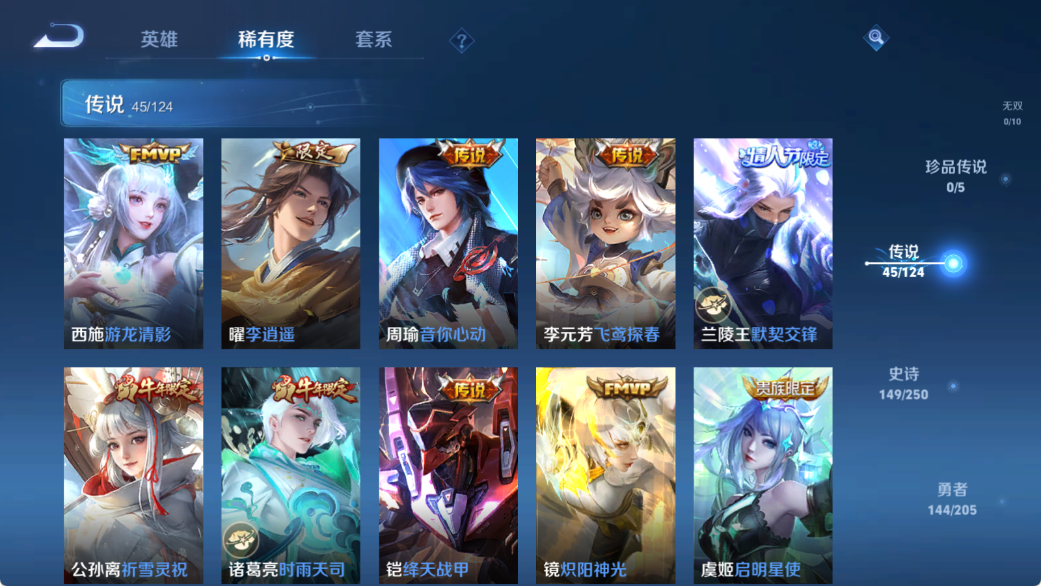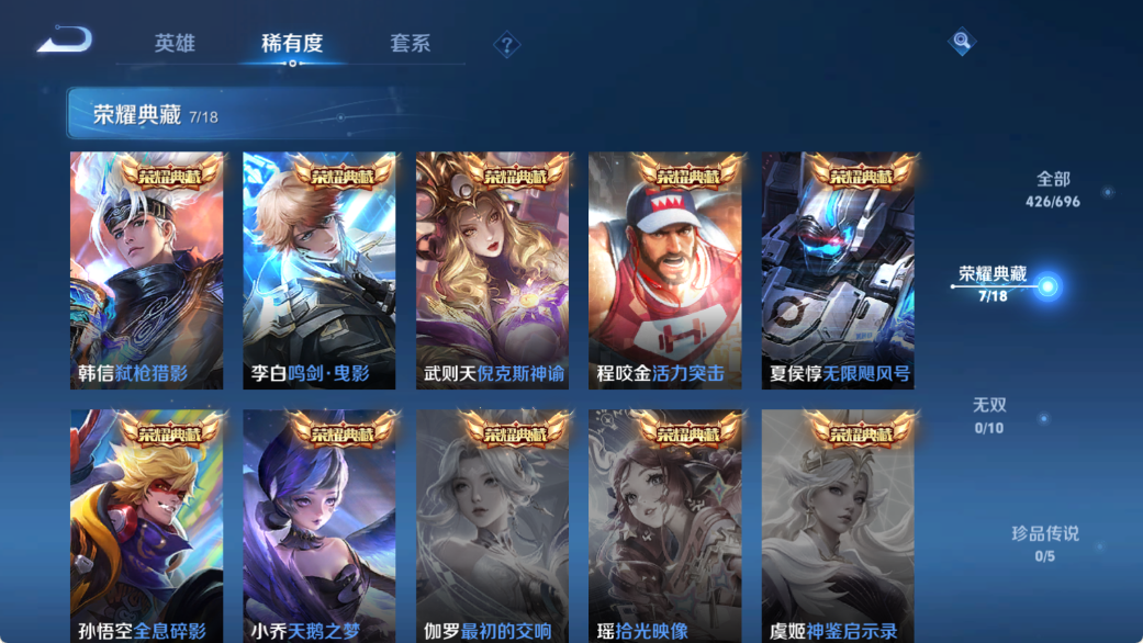 贵族等级V10,英雄数量122,典藏皮肤数7,皮肤数量426,天鹅之梦/无限飓风号/全息碎影/活力突击/倪克斯神谕/鸣剑·曳影/补天/异界灵契/淬星耀世