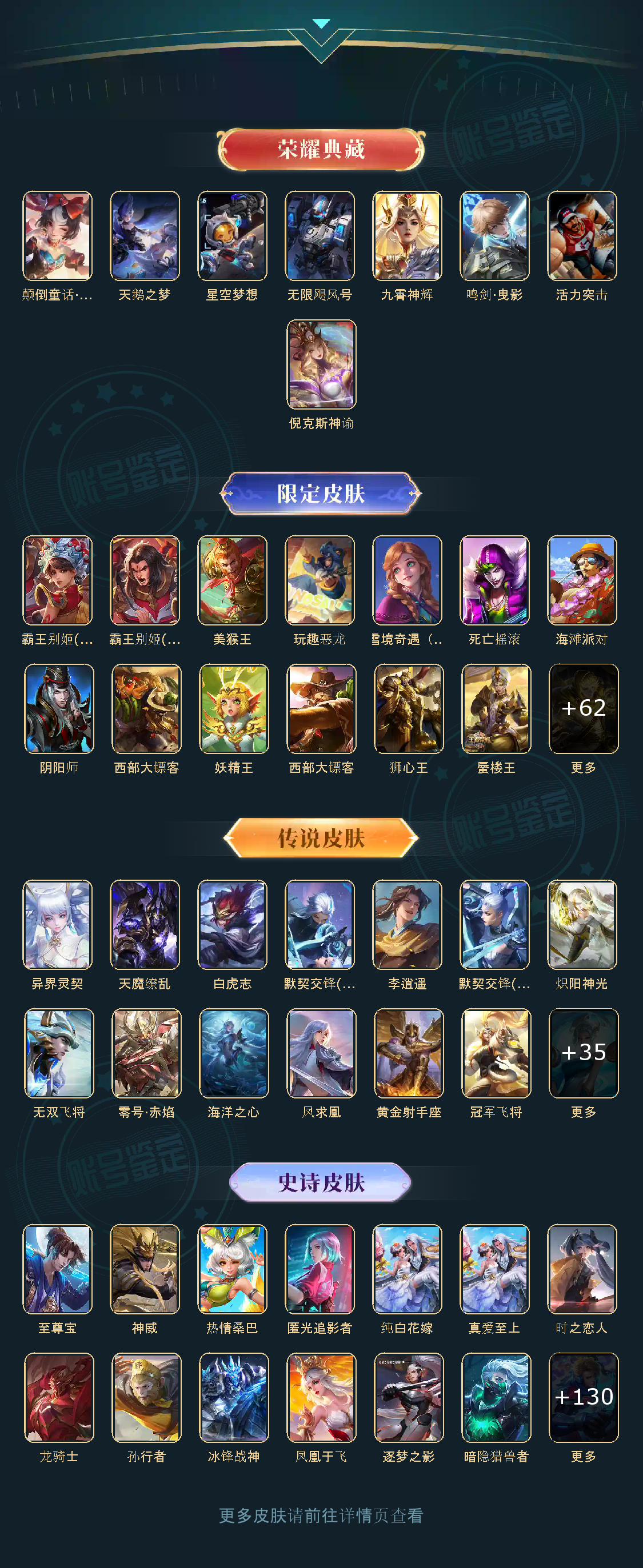 天鹅之梦,星空梦想,无限飓风号,鸣剑·曳影,九霄神辉,天魔缭乱,白虎志,默契交锋(兰陵王),李逍遥,默契交锋(花木兰),零号·赤焰,炽阳神光,热情桑巴,至尊宝,神威,纯白花嫁,真爱至上,匿光追影者,无双飞将,异界灵契