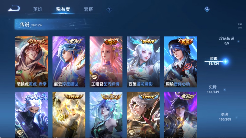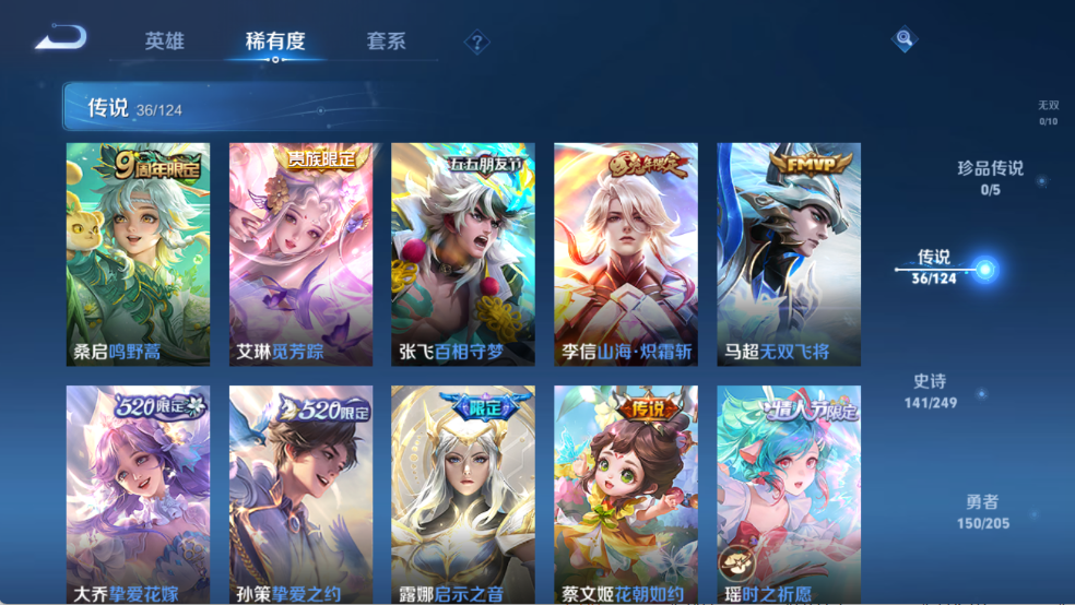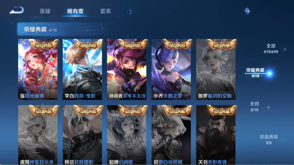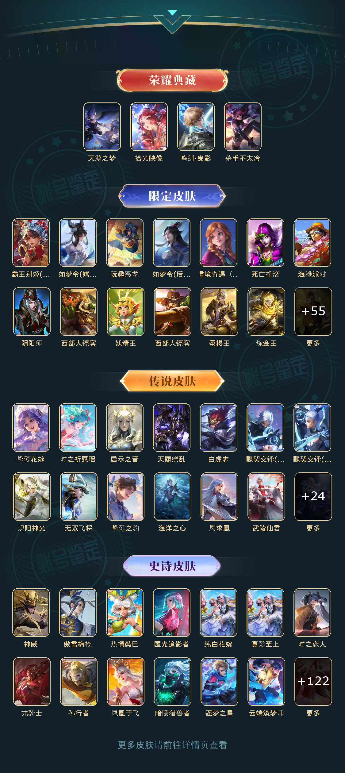 贵族等级V10,英雄数量122,典藏皮肤数4,皮肤数量415,