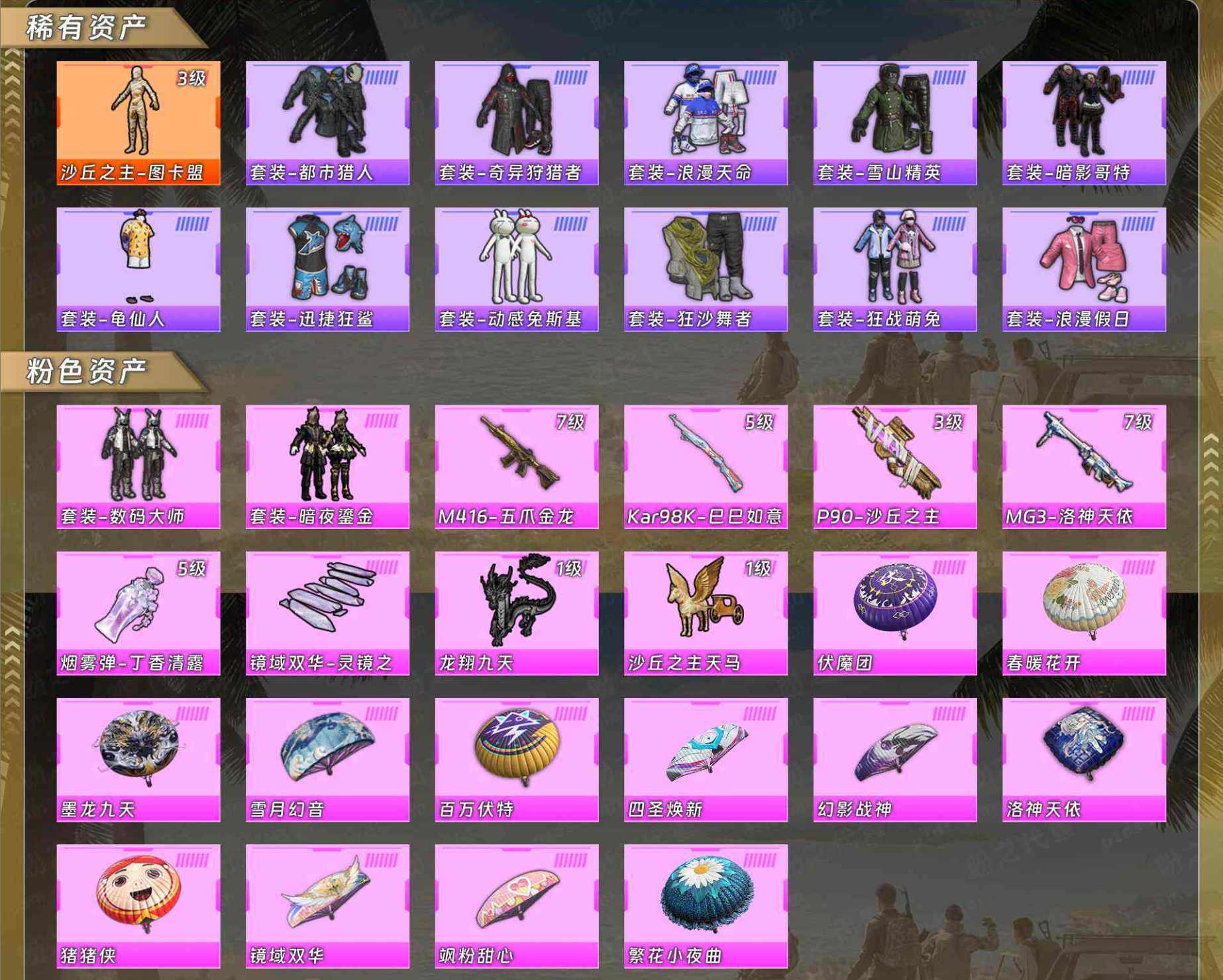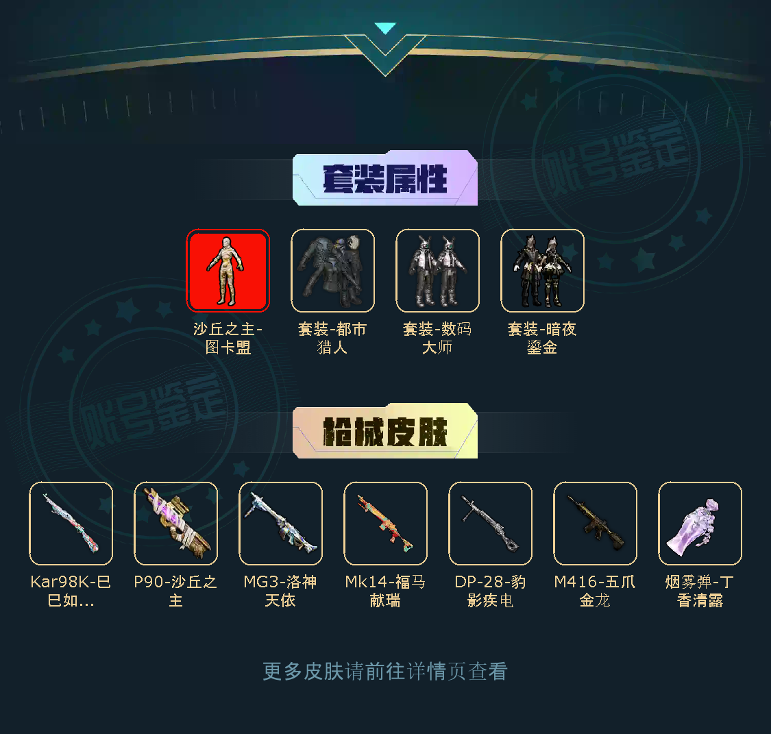 【稀有资产】沙丘之主-图卡盟[3级]/套装-都市猎人/套装-奇异狩猎者/套装-浪漫天命/套装-雪山精英/套装-暗影哥特/套装-龟仙人/套装-迅捷狂鲨/套装-动感兔斯基人偶服/套装-狂沙舞者/套装-狂战萌兔/套装-浪漫假日