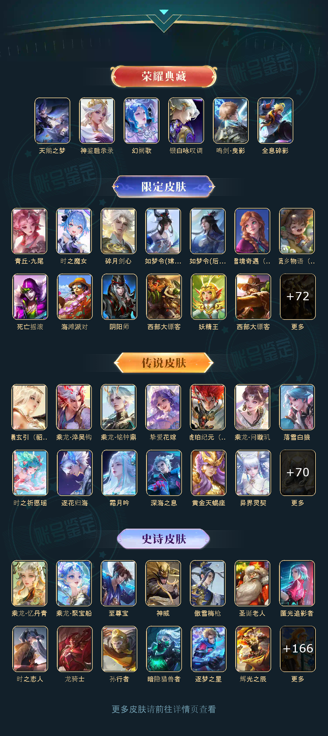 贵族等级V10,英雄数量125,典藏皮肤数6,皮肤数量521,
