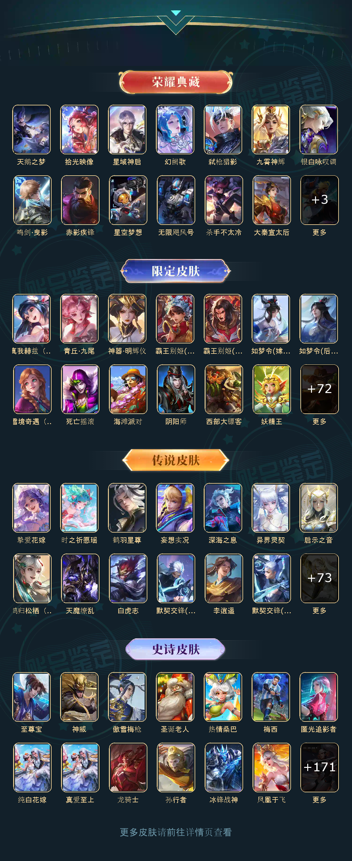 贵族等级V10,英雄数量124,典藏皮肤数15,皮肤数量540,无限飓风号/活力突击/倪克斯神谕/鸣剑·曳影/星域神启