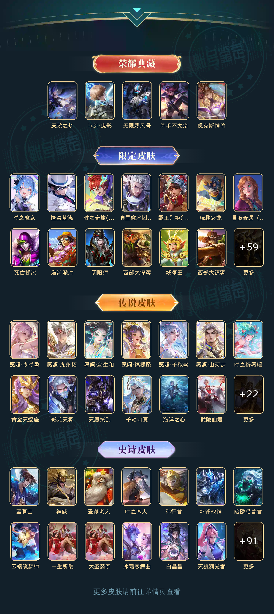 贵族等级V10,英雄数量125,典藏皮肤数5,皮肤数量382,天鹅之梦/杀手不太冷/无限飓风号/倪克斯神谕/鸣剑·曳影