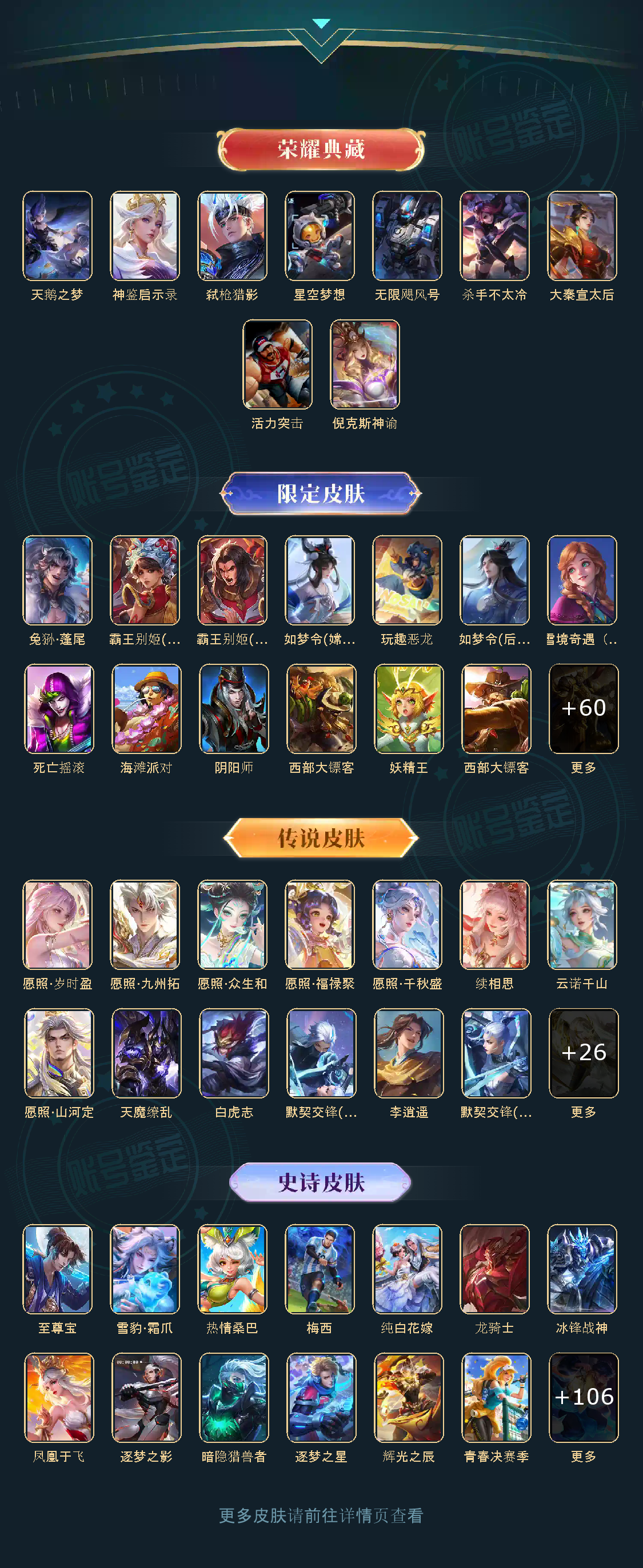 贵族等级V10,英雄数量124,典藏皮肤数8,皮肤数量417,天鹅之梦/星空梦想/无限飓风号/活力突击/倪克斯神谕