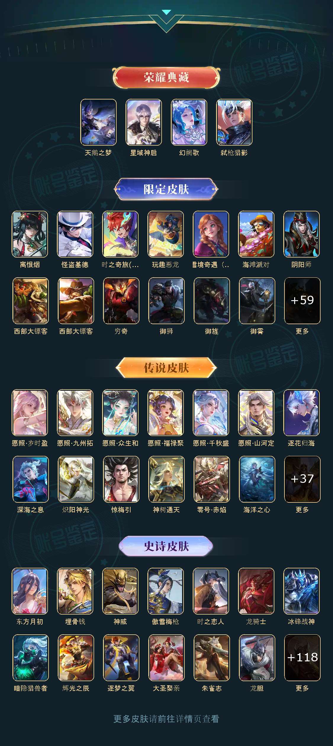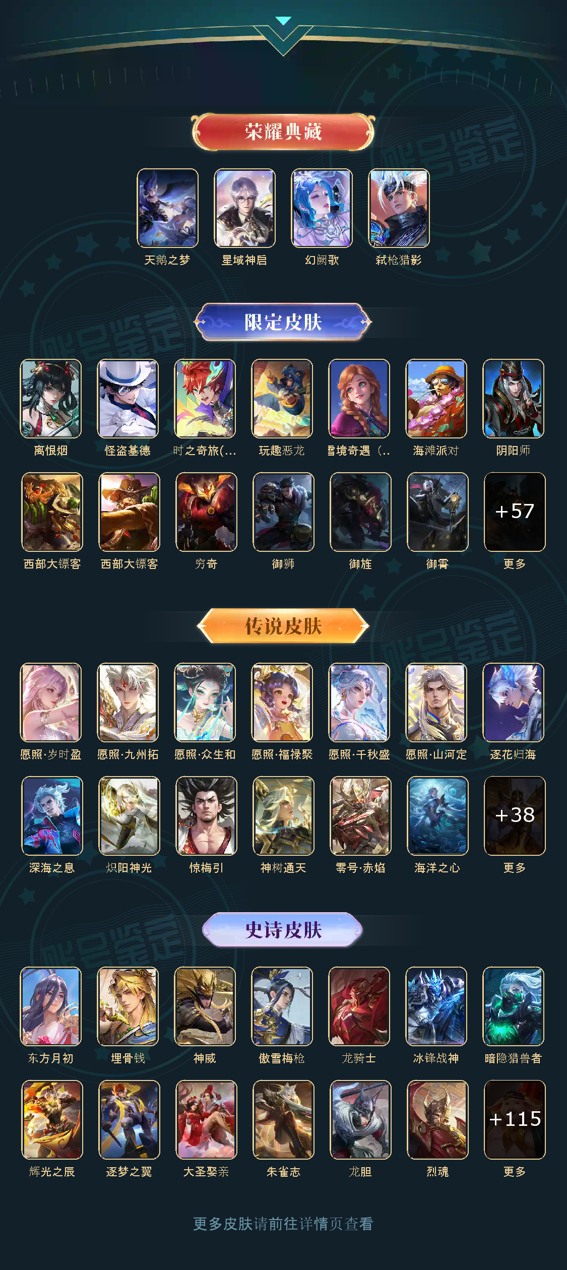 贵族等级V10,英雄数量124,典藏皮肤数4,皮肤数量405,天鹅之梦/星域神启