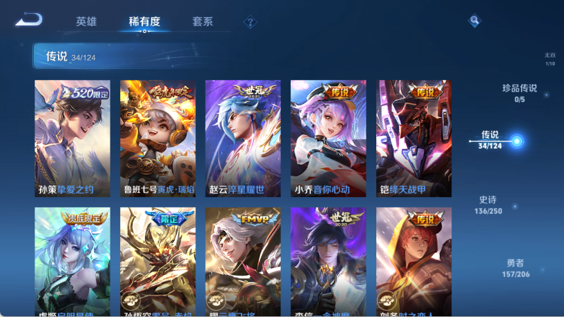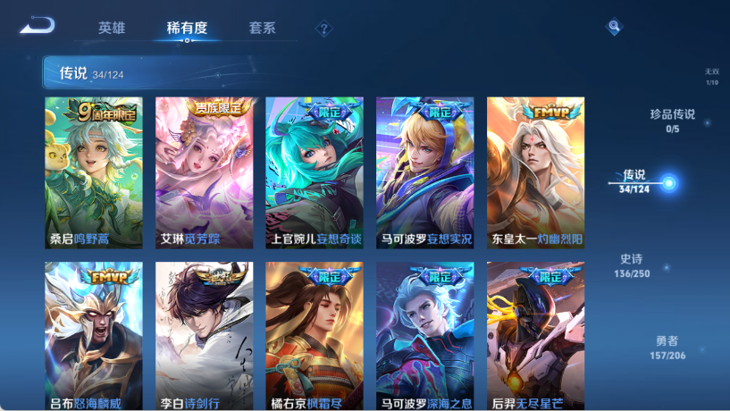 贵族等级V10,英雄数量125,典藏皮肤数5,皮肤数量414,