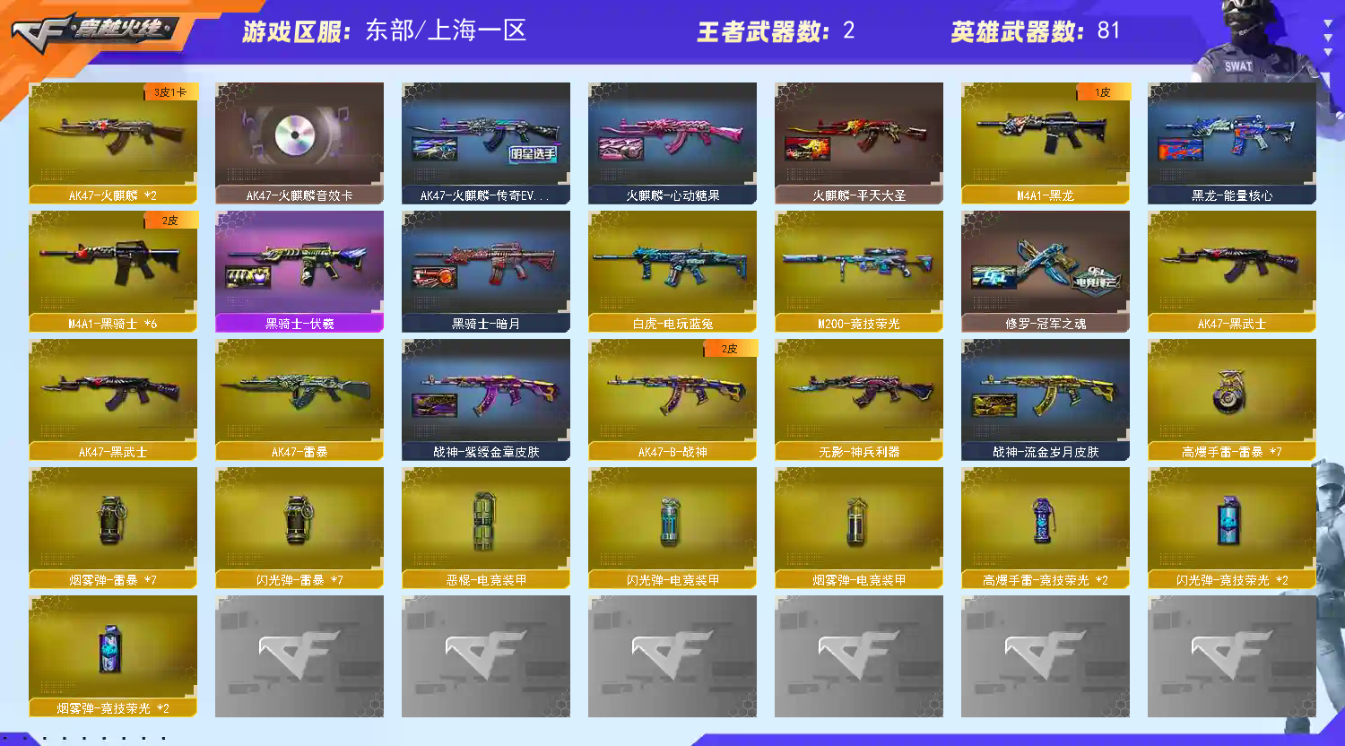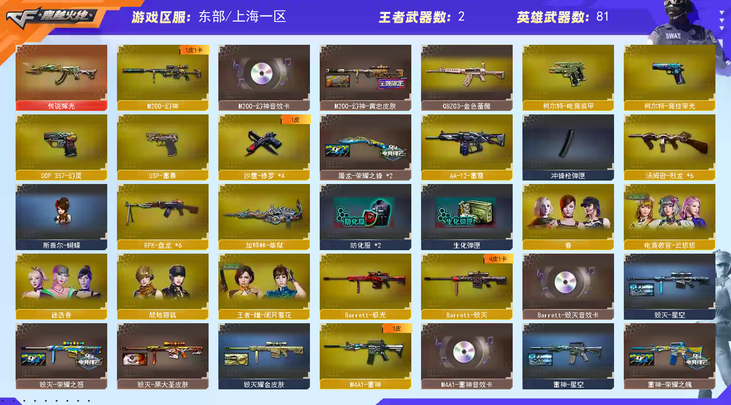 【英雄武器】_M200-幻神/M200-竞技荣光/Barrett-毁灭/Barrett-极光/M4A1-雷神/M4A1-黑龙/M4A1-黑骑士(6)/白虎-电玩蓝兔/AK47-火麒麟(2)/无影-神兵利器/AK47-雷暴/AK47-黑武士/AK47-B-战神/QBZ03-金色蔷薇/RPK-盘龙(6)/汤姆逊-烈龙(6)/AA-12-雷霆/加特林-炼狱/COP 357-幻灵/沙鹰-修罗(4)/柯尔特-电竞装甲/柯尔特-竞技荣光/USP-雷暴/龙啸/擎天/擎天-竞技荣光/王者之击-觉醒版/屠龙(4)/斩神刀-雷暴/高爆手雷-雷暴(7)/高爆手雷-竞技荣光(2)/烟雾弹-雷暴(7)/烟雾弹-竞技荣光(2)/烟雾弹-电竞装甲/恶棍-电竞装甲/闪光弹-雷暴(7)/闪光弹-竞技荣光(2)/闪光弹-电竞装甲