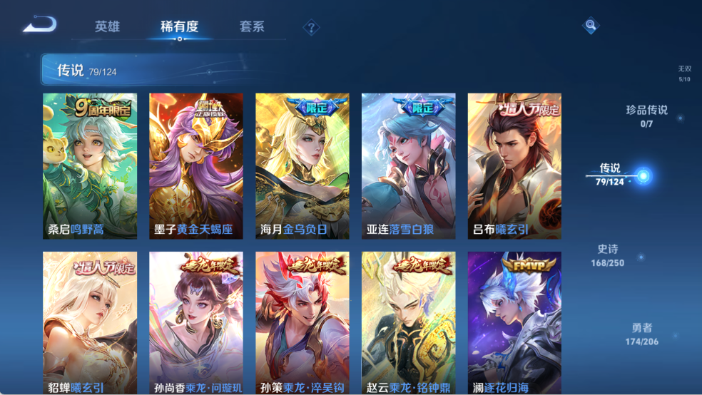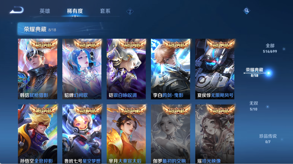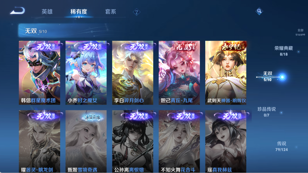 贵族等级V9,英雄数量125,典藏皮肤数8,皮肤数量516,