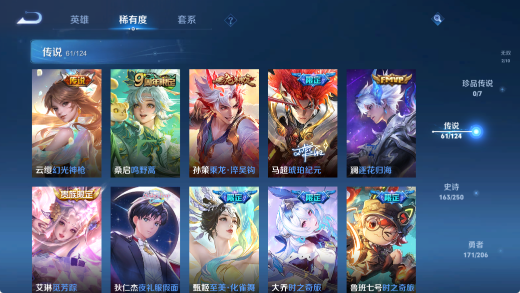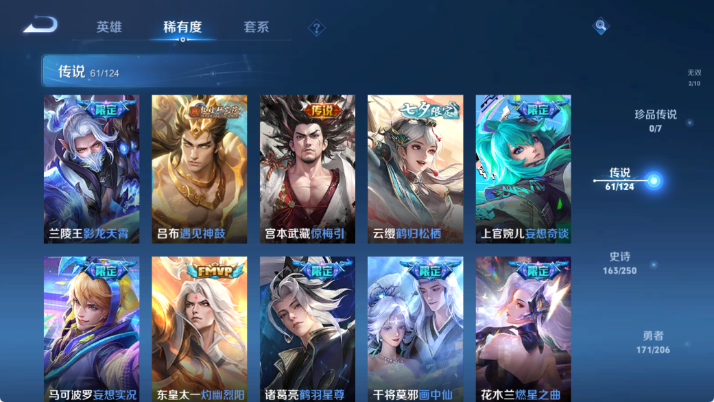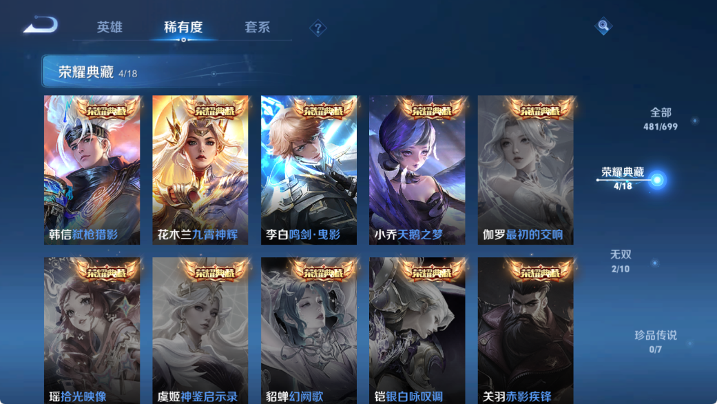 贵族等级V10,英雄数量123,典藏皮肤数4,皮肤数量481,天鹅之梦/鸣剑·曳影