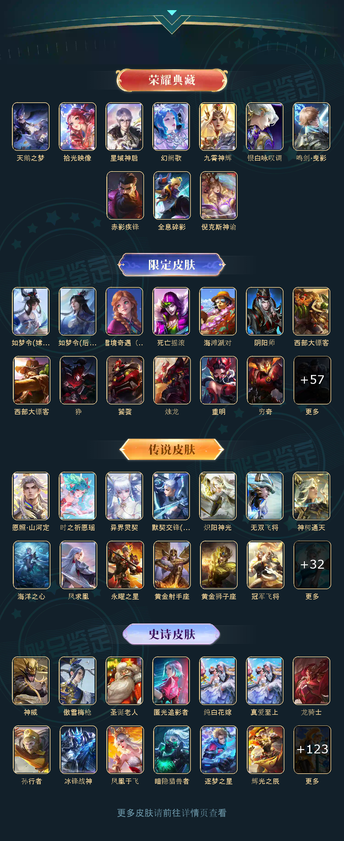 贵族等级V10,英雄数量125,典藏皮肤数10,皮肤数量429,天鹅之梦/全息碎影/倪克斯神谕/鸣剑·曳影/星域神启