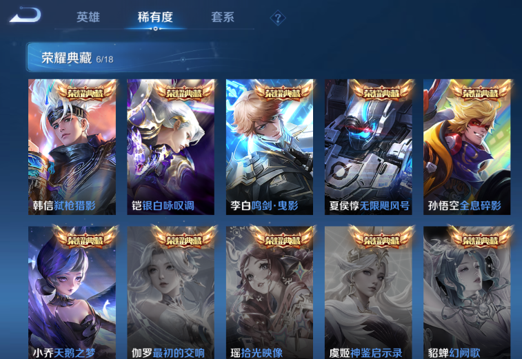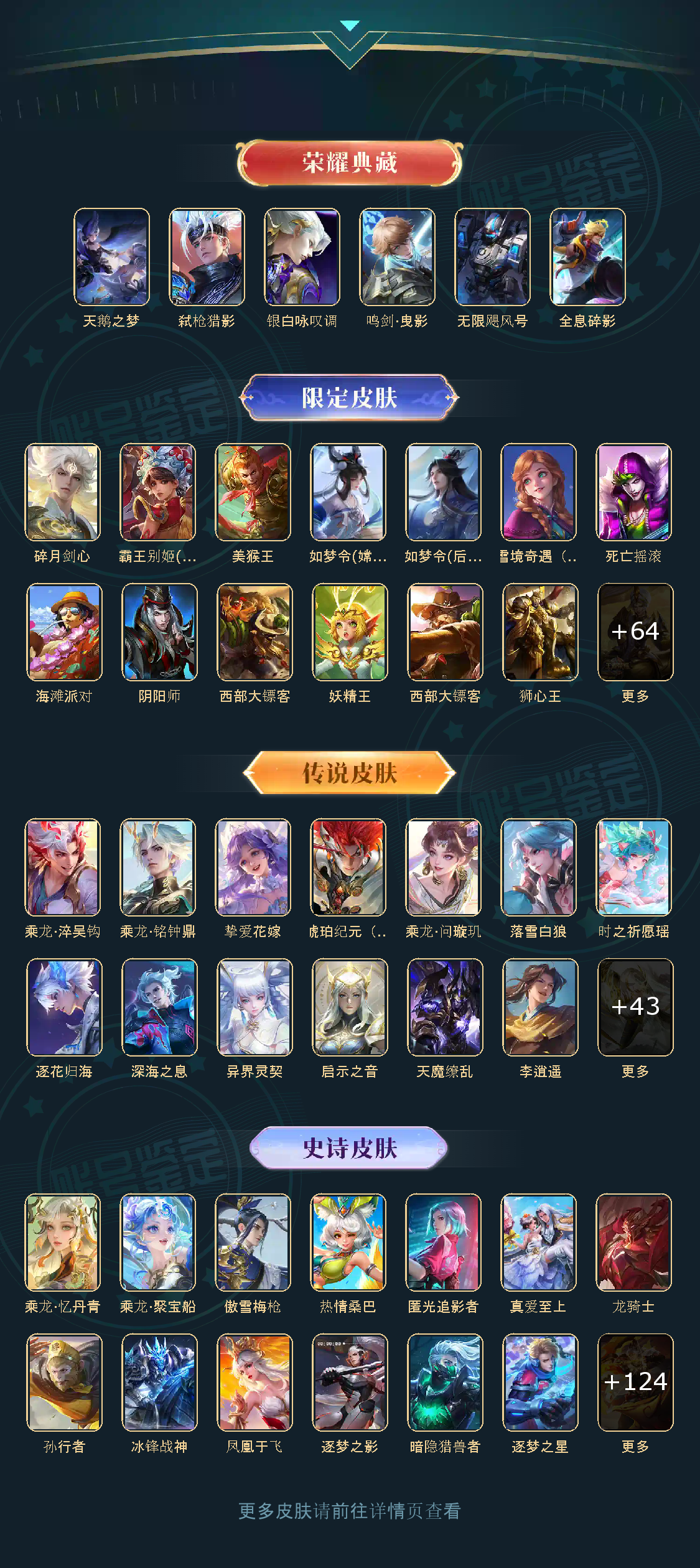贵族等级V10,英雄数量125,典藏皮肤数6,皮肤数量443,天鹅之梦/无限飓风号/全息碎影/鸣剑·曳影