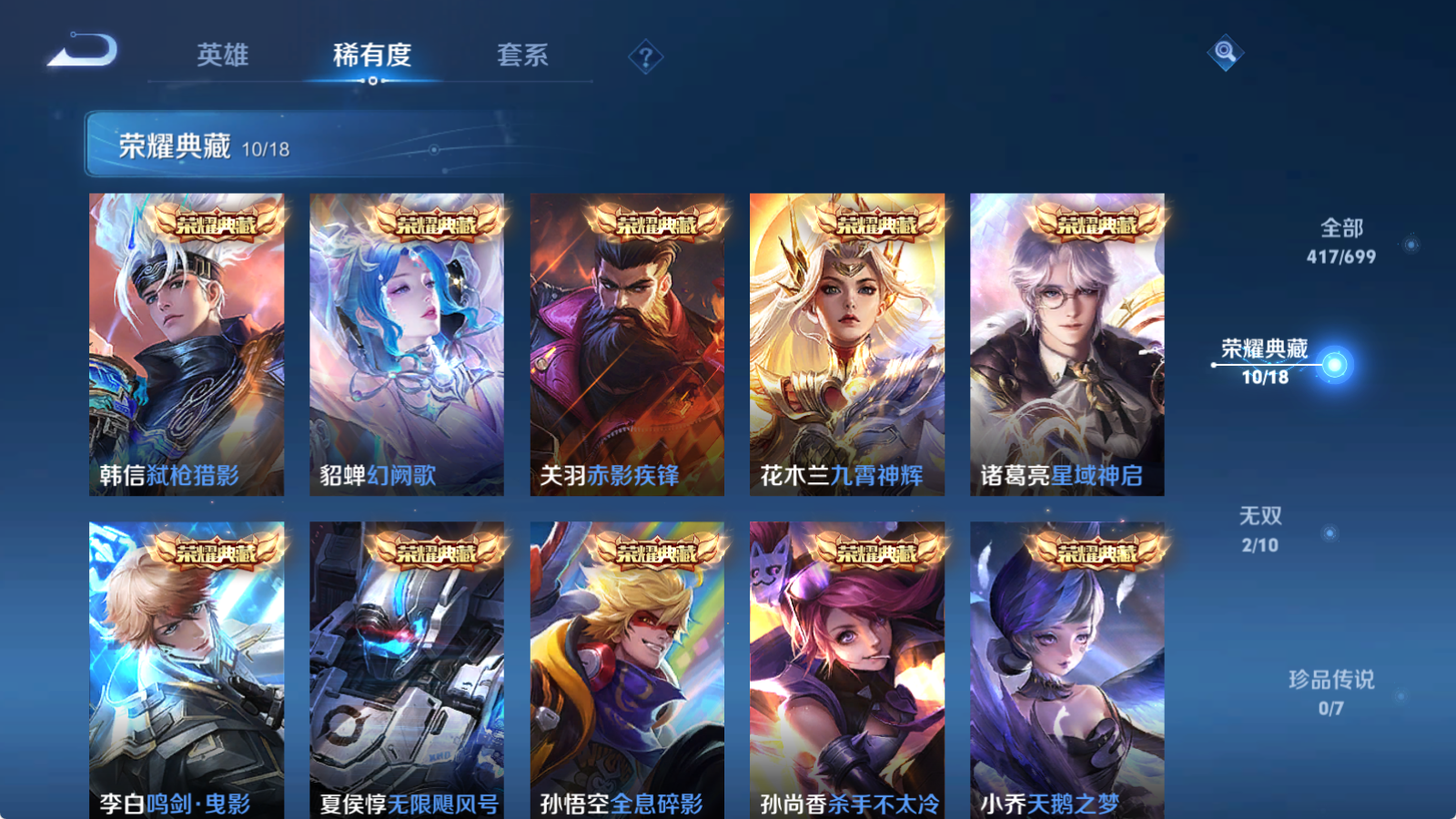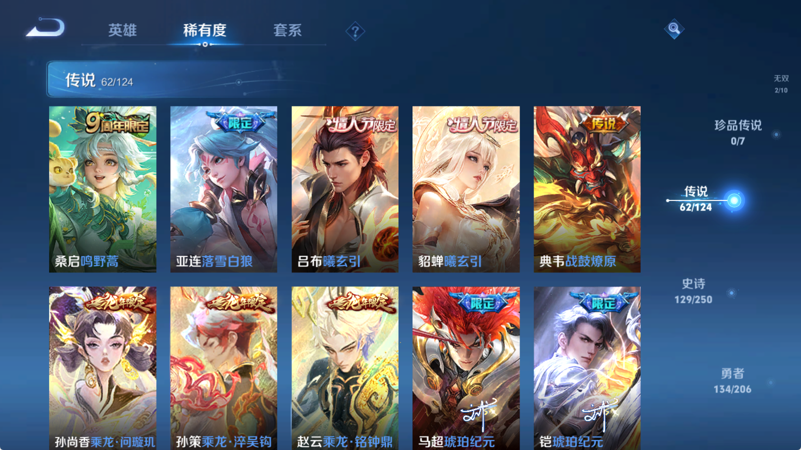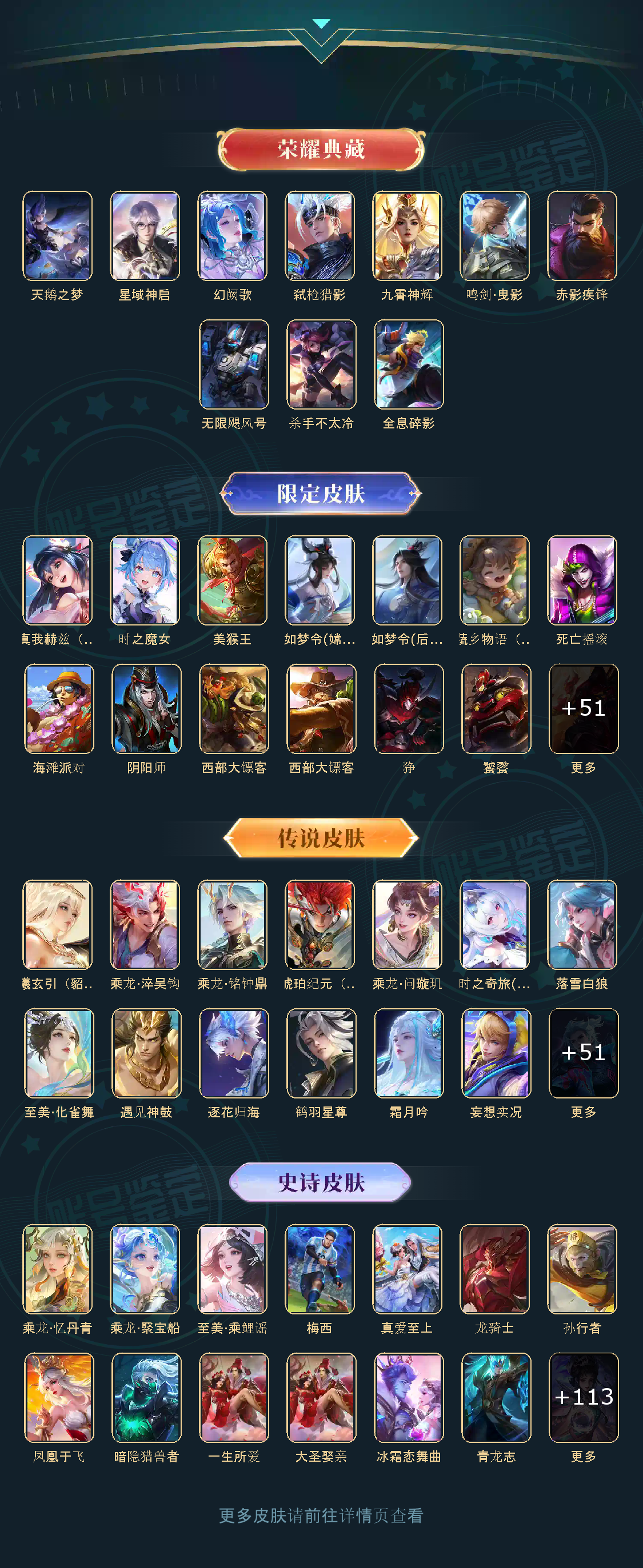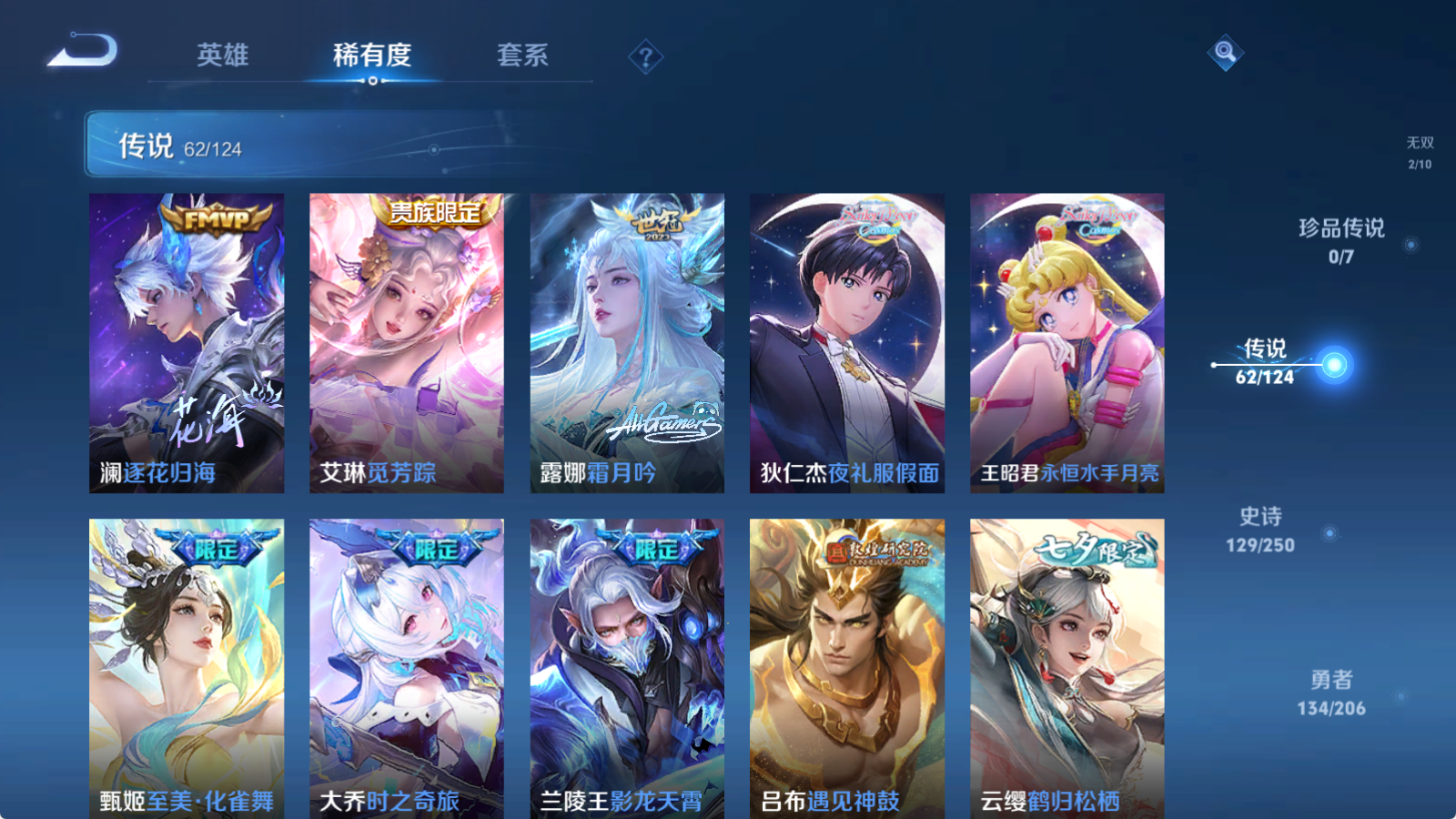 贵族等级V10,英雄数量124,典藏皮肤数10,皮肤数量417,天鹅之梦/杀手不太冷/无限飓风号/全息碎影/鸣剑·曳影/星域神启