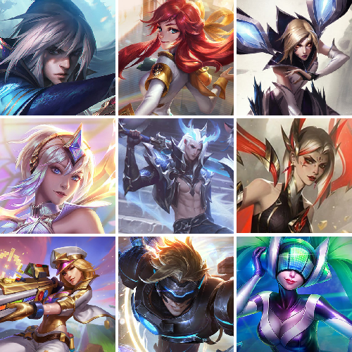 【传说皮肤】心之钢凯隐 墨之影武者易 青花瓷奥瑞利安索尔 魔女娜美 太空律动律动队长提莫 神龙尊者昼日真龙亚索 暗星女王拉克丝 地狱行者孙悟空 耀星女神拉克丝 至高天派克 星之守护者阿卡丽 血石领主弗拉基米尔 魔幻卡牌崔斯特 恶魔之刃泰达米尔 黯黑魔龙希瓦娜 烈焰雄心崔丝塔娜 金牌主播德莱文 女主播迦娜 影执事劫 蔷薇绅士杰斯 星之守护者阿狸 神龙尊者夜月幻龙亚索 冰川巨兽墨菲特 泳池派对吉格斯 神龙尊者圣龙李青 光明哨兵格雷福斯 源计划毁灭派克 铁哥们儿奥拉夫 源计划林易 冰霜之刃艾瑞莉娅 星之守护者金克丝 女校长菲奥娜 苹果机器人布里茨 源计划超体莫德凯撒 星之守护者净化之羽霞 腥红之月鬼武姬阿卡丽 约德尔国队长提莫 符文战熊沃利贝尔 宇航员诺提勒斯 奥德赛凯隐 魔女伊芙琳 战场女武神凯尔 真实伤害艾克 邪鸦魅影乐芙兰 星之守护者卡莎 第三类接触黑默丁格 太空律动猫猫布里和里茨 黑夜使者索拉卡 恶魔男爵瑞兹 黯晶凤凰艾尼维亚 神王德莱厄斯 日蚀骑士希维尔 炼狱魔犬内瑟斯 死亡骑士盖伦 最终BOSS维迦 苍穹之光韦鲁斯 星之守护者霞 战斗学院伊泽瑞尔 合金巨兽努努和威朗普 地狱之门卫士加里奥 神王盖伦 光明哨兵薇恩 女皇艾希 屠龙勇士潘森 灵魂莲华瑟提 未来战士凯特琳 冰霜亚龙希瓦娜 枯萎之壤泽拉斯 源计划净化薇恩 驯龙学者黑默丁格 律政大亨蒙多 战地巨兽科加斯 钢铁之翼凯尔 银河魔装机神兰博 灵魂莲华锤石 青花瓷伊泽瑞尔 星之守护者洛 灵魂莲华阿狸 暗星尊烬 钢铁军团盖伦 星之守护者净化之翎洛 绅士科加斯 西部天使赛娜 源计划联合艾希 星之守护者拉克丝 灵能特工娑娜 焰尾妖狐阿狸 黑夜使者亚索 绝息圣堂锐雯 战斗学院凯特琳 驯龙炮手崔丝塔娜 至尊魔女莫甘娜 源计划泯灭雷克顿 黎明使者索拉卡 暗星锤石 战地机甲厄加特 西部魔影大小姐蕾欧娜 霸天零式赛恩 女帝卡特琳娜 西部天使艾希 西部魔影卢锡安 灌篮高手德莱厄斯 天煞劫 黎明使者锐雯 大天使长米迦勒凯尔 上古战魂魔腾 提莫约德尔人的一大步 欧米伽小队幽灵特工 月蚀骑士蕾欧娜 丧尸布兰德 红色男爵库奇 偶像歌手阿狸 霸天异形卡兹克 女警狙击凯特琳 双重冰晶艾尼维亚 幻灵战斗队长厄运小姐 神拳李青 电玩女神娑娜 陆地王者4WD布里茨 黎明使者永恩 鬼魂新娘莫甘娜