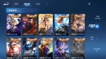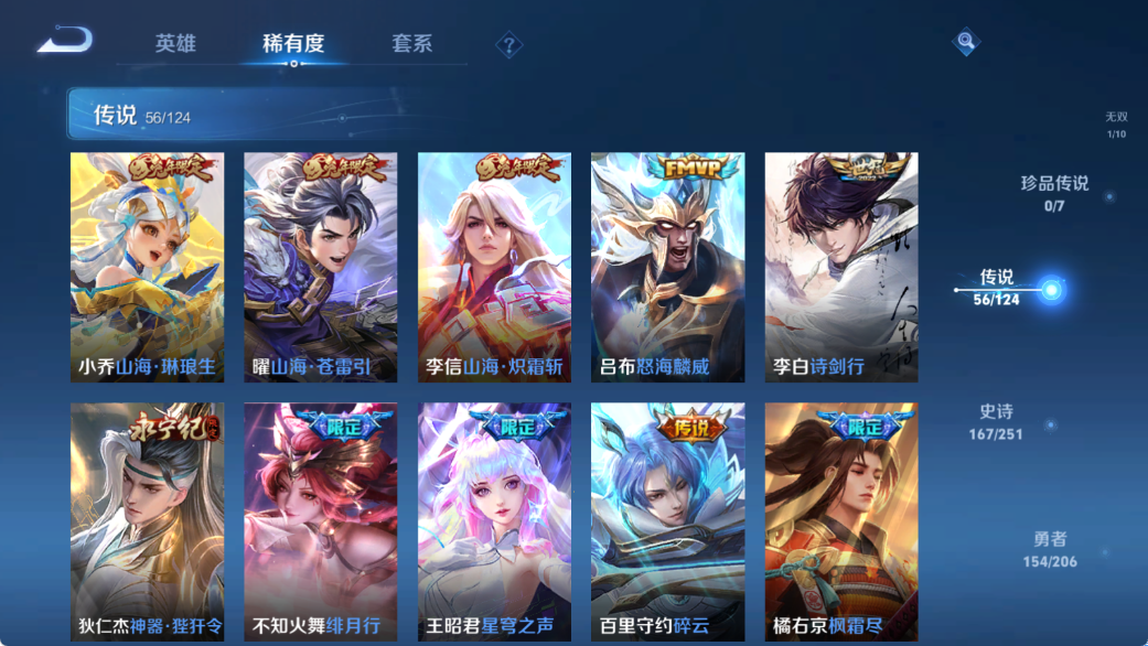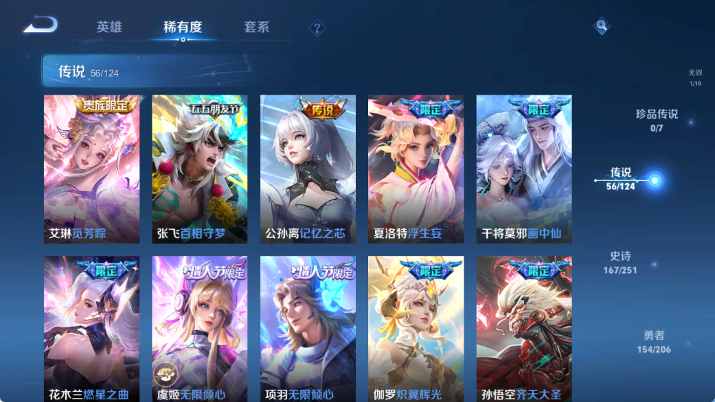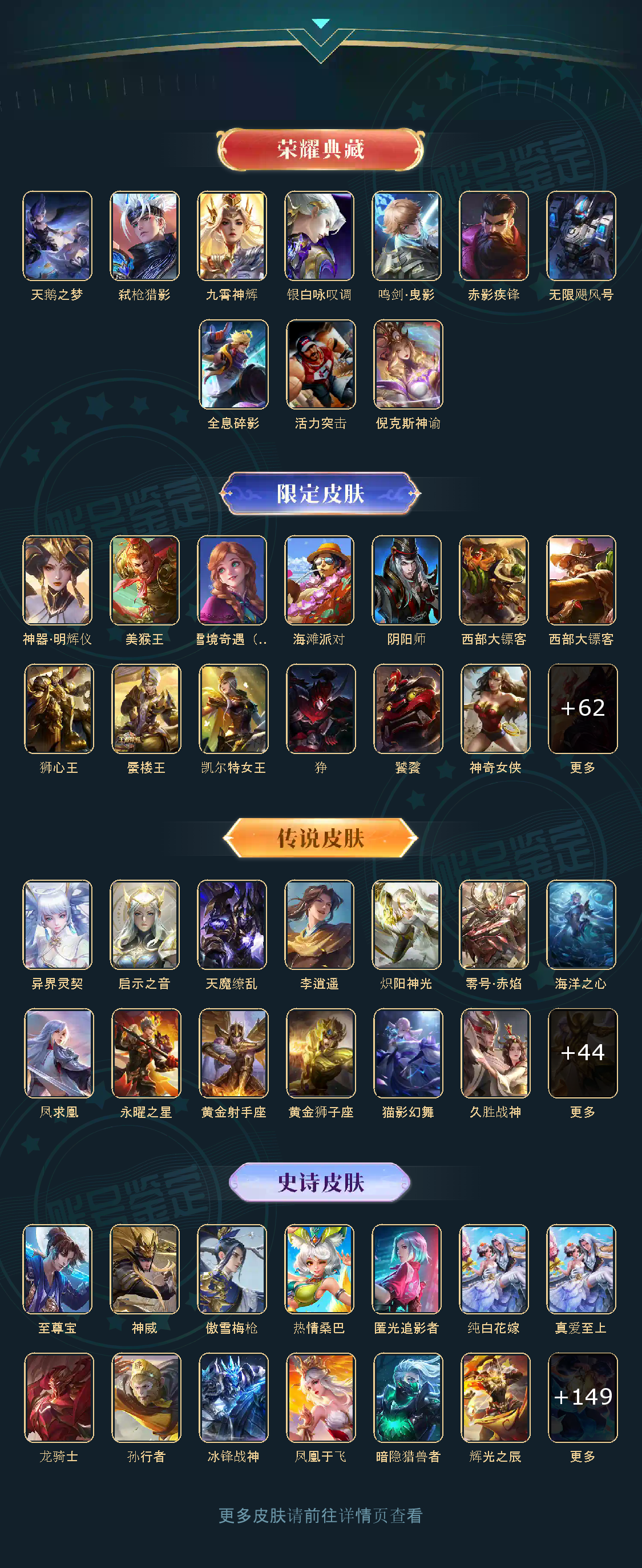 贵族等级V10,英雄数量124,典藏皮肤数9,皮肤数量467,天鹅之梦/无限飓风号/全息碎影/活力突击/倪克斯神谕/鸣剑·曳影