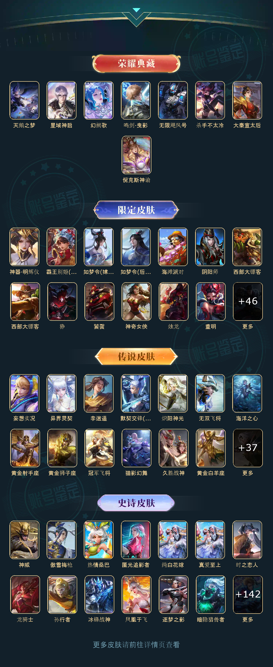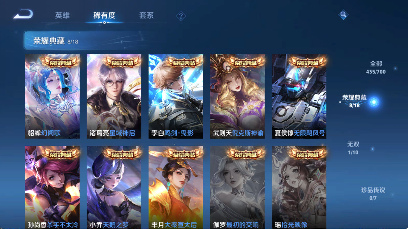 贵族等级V10,英雄数量123,典藏皮肤数8,皮肤数量435,天鹅之梦/杀手不太冷/大秦宣太后/无限飓风号/倪克斯神谕/鸣剑·曳影/星域神启