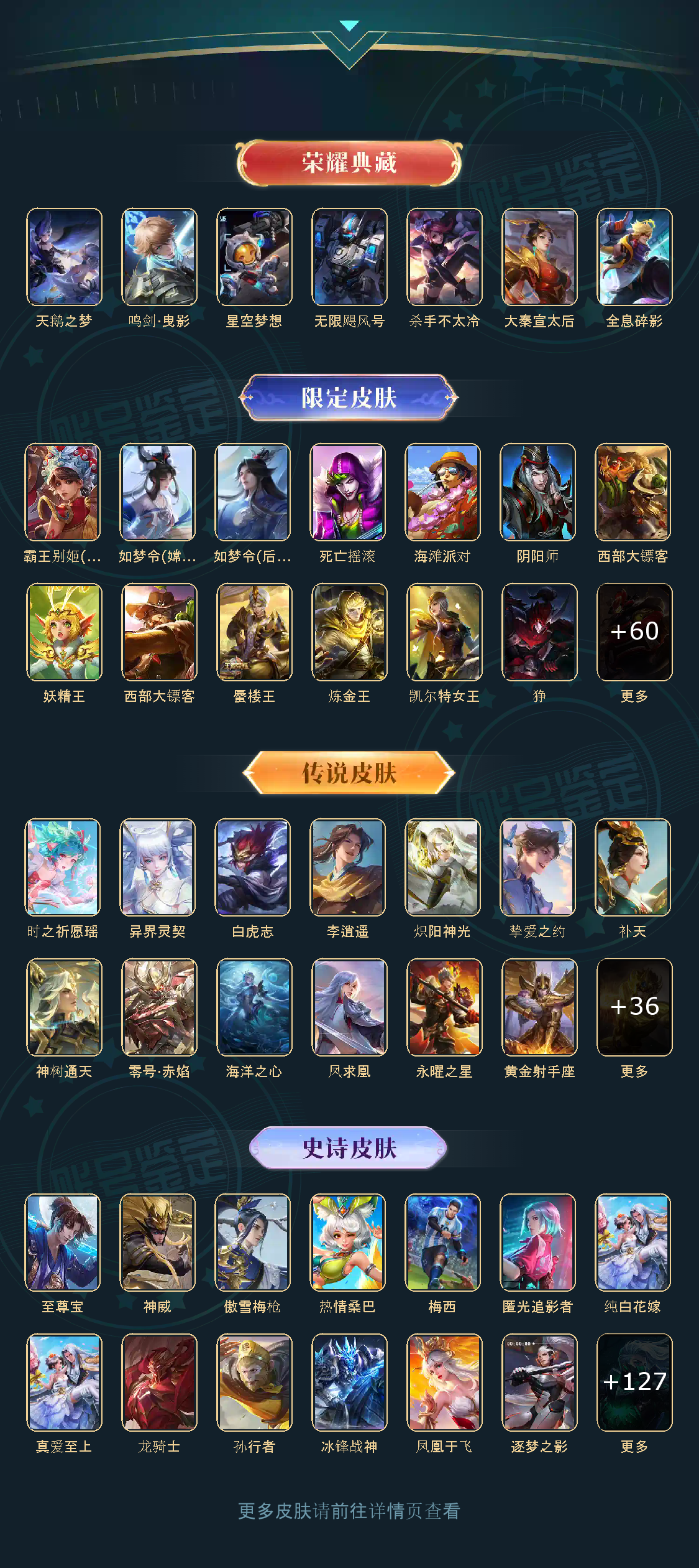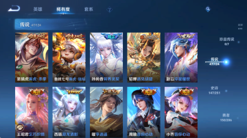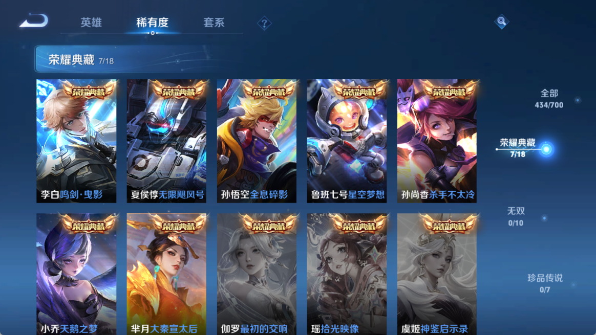 贵族等级V10,英雄数量124,典藏皮肤数7,皮肤数量434,天鹅之梦/杀手不太冷/大秦宣太后/星空梦想/无限飓风号/全息碎影/鸣剑·曳影/李逍遥/补天