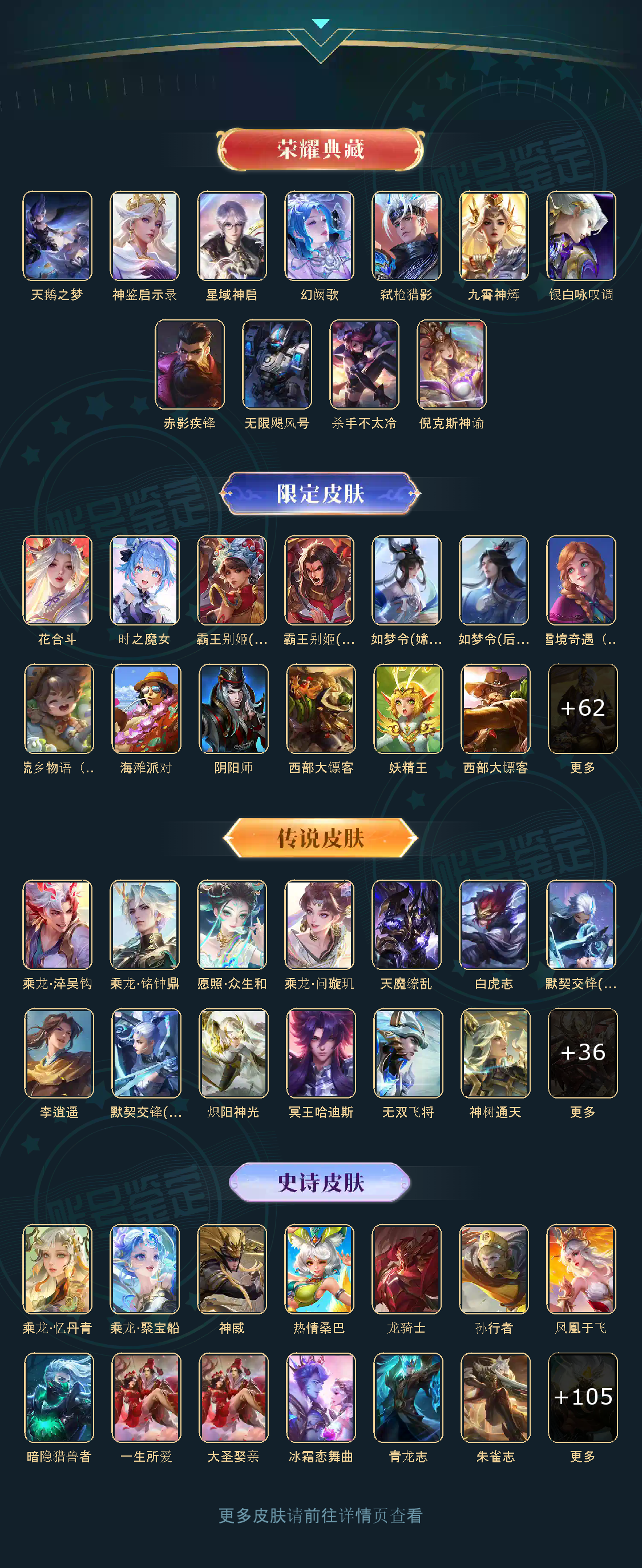 贵族等级V10,英雄数量125,典藏皮肤数10,皮肤数量411,杀手不太冷/无限飓风号/倪克斯神谕/星域神启