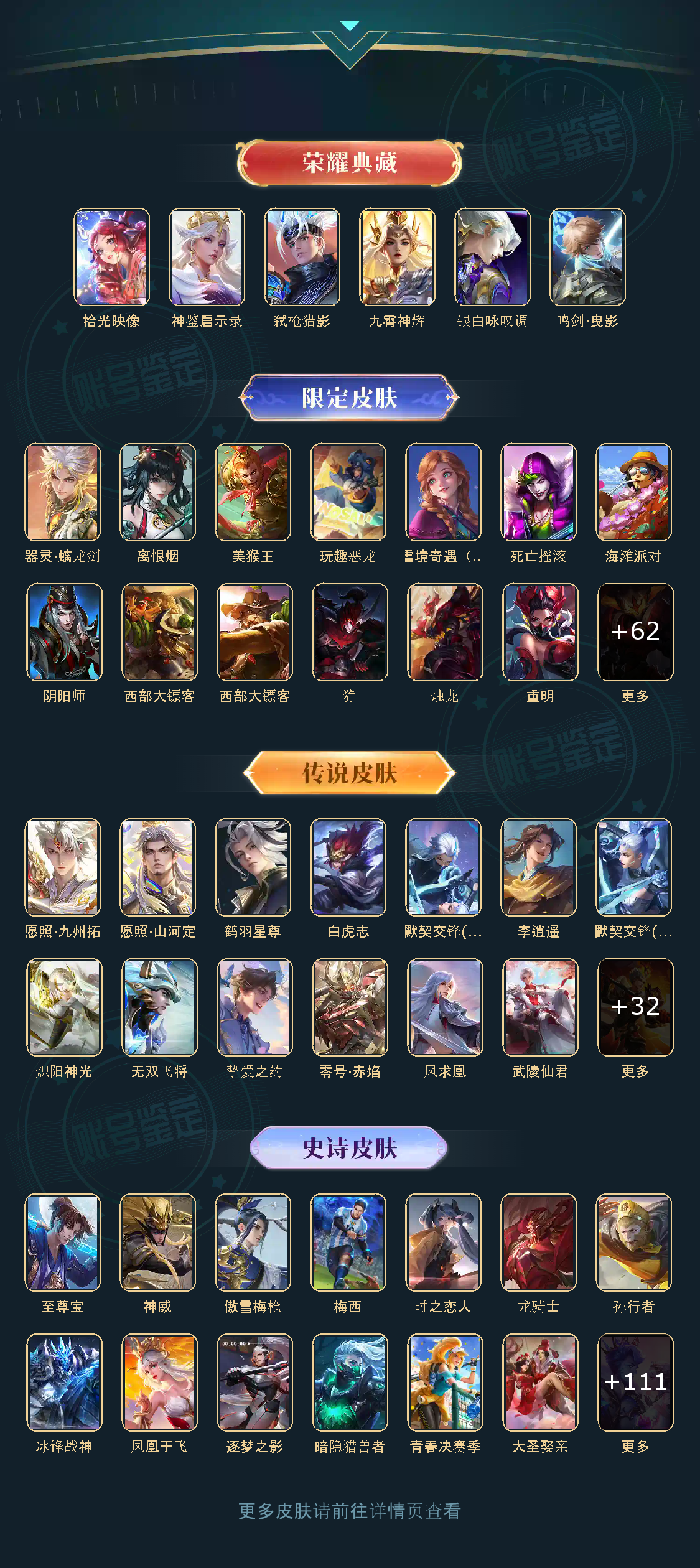 贵族等级V10,英雄数量123,典藏皮肤数6,皮肤数量422,鸣剑·曳影