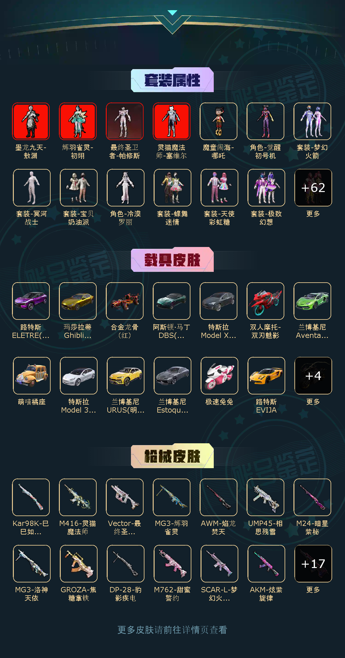 满级红装,哪吒塞维尔帕修斯初翎敖渊可切换✨木乃伊觉醒螳螂✨满级路特斯✨红龙骨金玛莎雀灵自行车✨70粉26特17载具70粉,17载具,339套装,15王牌印记 UZI-绮梦青鸾/SCAR-L-梦幻火箭/Vector-飒粉甜心/Kar98K-伏魔团/AUG-星之彼岸/M249-彩虹甜喵/MG3-辉羽雀灵/汤姆逊-怪笑疯兔/AWM-焰龙焚天/Kar98K-巳巳如意/M416-心之恋语/M16A4-葫芦兄弟/Mini14-荧光虫舞/M24-暗星紫秘/DP-28-枪炮玫瑰/M16A4-垂柳戏鸭/AKM-炫紫旋律/MG3-洛神天依/M416-墨龙九天/GROZA-焦糖拿铁/M249-古战神甲/SLR-暗夜玫瑰/S12K-海渊国主/M762-甜蜜誓约/UMP45-相思残雪/野牛-流星咚咚/路特斯EVIJA(星际黄)/兰博基尼Aventador(翡翠绿)/玛莎拉蒂Ghibli(金)/萌喵橘座/疾风龙骑/辉羽雀灵自行车/特斯拉Model 3(珍珠白)/兰博基尼URUS(明艳黄)/快艇-塞莎KL27(霓虹粉)/双人摩托-双刃魅影(红)/兰博基尼Estoque(银翼灰)/路特斯ELETRE(电光紫)/阿斯顿·马丁DBS(绿)/极速兔兔/鬼马风驰/合金龙骨(红)/特斯拉Model X(冷光银)/