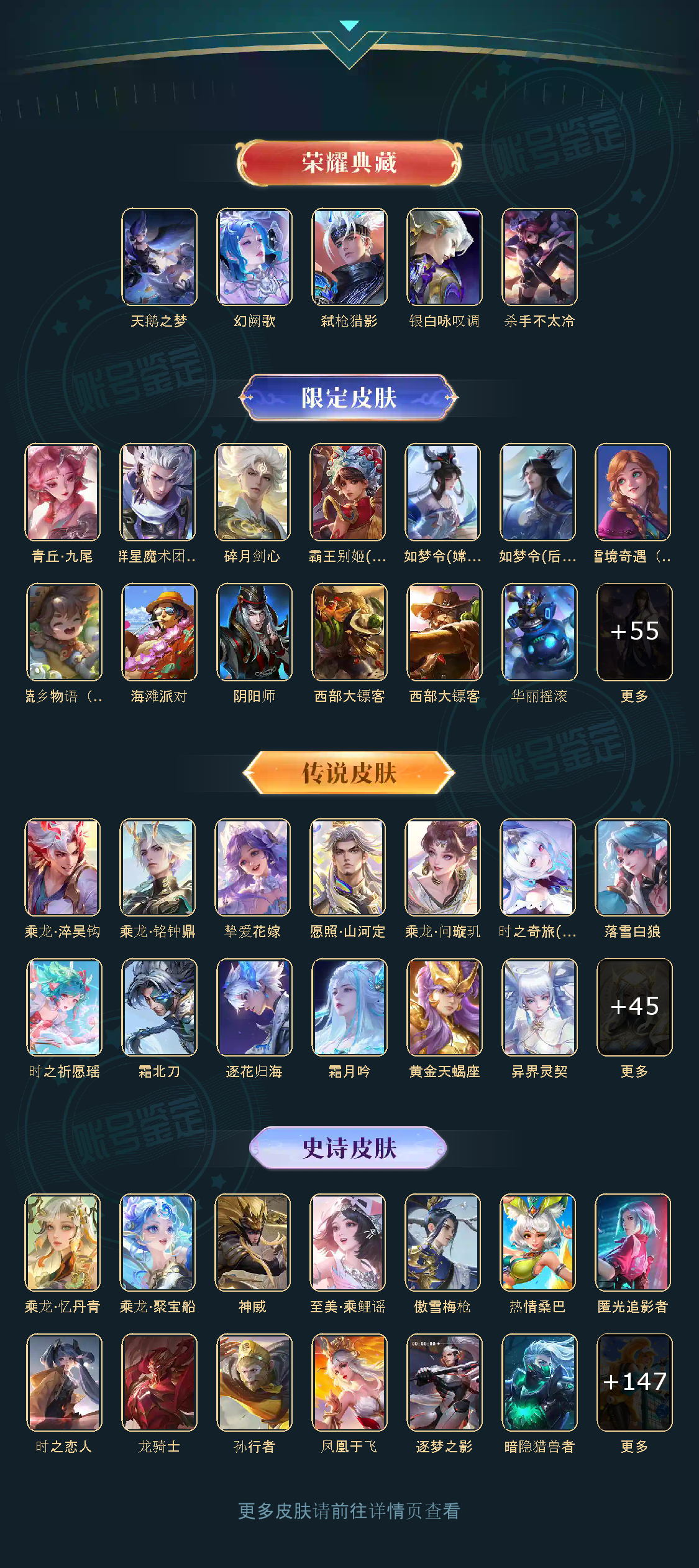 贵族等级V10,英雄数量124,典藏皮肤数4,皮肤数量465,天鹅之梦/杀手不太冷