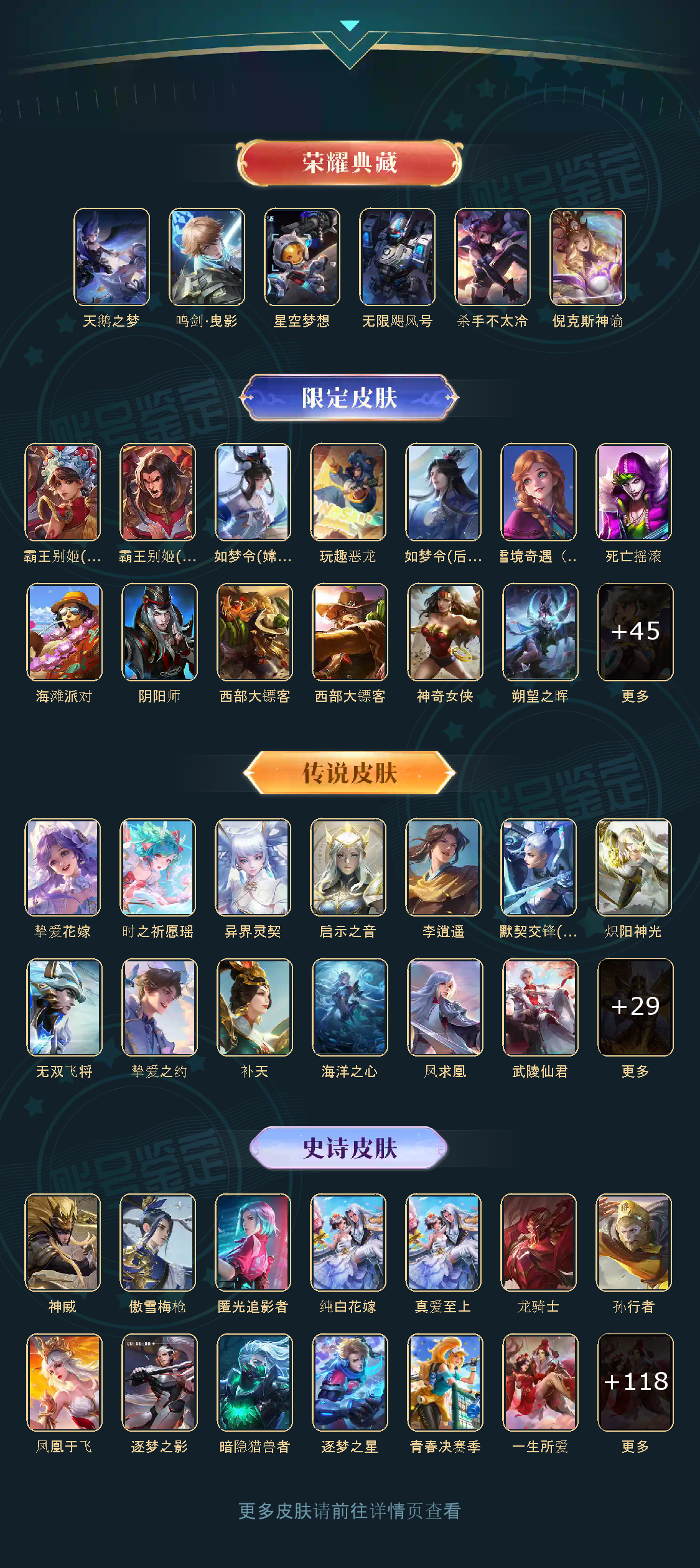 贵族等级V10,英雄数量123,典藏皮肤数6,皮肤数量399,