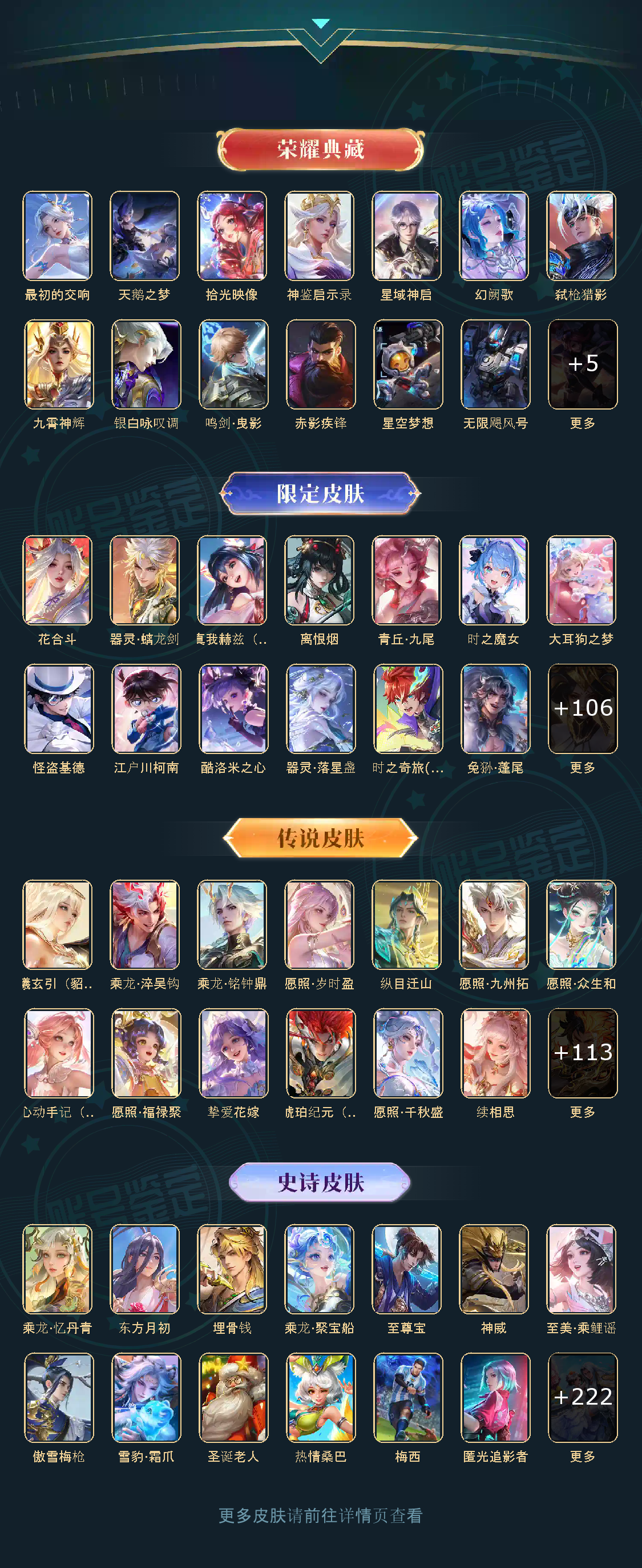 贵族等级V10,英雄数量128,典藏皮肤数18,皮肤数量714,纯白花嫁/天魔缭乱/至尊宝/真爱至上/圣诞老人/热情桑巴/梅西/白虎志/久胜战神/飞衡/器灵·螭龙剑/愿照·九州拓/愿照·众生和/匿光追影者/冥王哈迪斯/神器·明辉仪/鸣剑·曳影/乘龙·问璇玑/群星魔术团(韩信)/神鉴启示录/心动手记(朵莉亚)/时之奇旅(大乔)/赤影疾锋/真我赫兹(瑶)/时之奇旅(鲁班七号)/落雪白狼/愿照·福禄聚/无双飞将/至美·化雀舞/时之祈愿瑶/遇见神鼓/挚爱花嫁/星域神启/李逍遥/花合斗/涂山红红/霜北刀/逐花归海/器灵·落星盏/琥珀纪元(马超)/幻阙歌/至美·乘鲤谣/鹤羽星尊/时之奇旅(孙策)/曦玄引(貂蝉)/离恨烟/碎月剑心/愿照·千秋盛/霜月吟/雪境奇遇(甄姬)/乘龙·淬吴钩/东方月初/拾光映像/乘龙·铭钟鼎/妄想实况/大耳狗之梦/埋骨钱/深海之息/最初的交响/黄金天蝎座/夜礼服假面/兔狲·蓬尾/玉兔公主/补天/怪盗基德/愿照·岁时盈/乘龙·聚宝船/惊梅引/弑枪猎影/续相思/异界灵契/神威/祥瑞亨通/炽阳神光/启示之音/乘龙·忆丹青/影龙天霄/心动手记(海诺)/九霄神辉/青丘·九尾/江户川柯南/云诺千山/鹤归松栖(云缨)/银白咏叹调/愿照·山河定/酷洛米之心/时之魔女/傲雪梅枪/雪豹·霜爪/神罪/纯白花嫁/天魔缭乱/至尊宝/真爱至上/圣诞老人/热情桑巴/梅西/白虎志/久胜战神/飞衡/器灵·螭龙剑/愿照·九州拓/愿照·众生和/匿光追影者/冥王哈迪斯/神器·明辉仪/鸣剑·曳影/乘龙·问璇玑/群星魔术团(韩信)/神鉴启示录/心动手记(朵莉亚)/时之奇旅(大乔)/赤影疾锋/真我赫兹(瑶)/时之奇旅(鲁班七号)/落雪白狼/愿照·福禄聚/无双飞将/至美·化雀舞/时之祈愿瑶/遇见神鼓/挚爱花嫁/星域神启/李逍遥/花合斗/涂山红红/霜北刀/逐花归海/器灵·落星盏/琥珀纪元(马超)/幻阙歌/至美·乘鲤谣/鹤羽星尊/时之奇旅(孙策)/曦玄引(貂蝉)/离恨烟/碎月剑心/愿照·千秋盛/霜月吟/雪境奇遇(甄姬)/乘龙·淬吴钩/东方月初/拾光映像/乘龙·铭钟鼎/妄想实况/大耳狗之梦/埋骨钱/深海之息/最初的交响/黄金天蝎座/夜礼服假面/兔狲·蓬尾/玉兔公主/补天/怪盗基德/愿照·岁时盈/乘龙·聚宝船/惊梅引/弑枪猎影/续相思/异界灵契/神威/祥瑞亨通/炽阳神光/启示之音/乘龙·忆丹青/影龙天霄/心动手记(海诺)/九霄神辉/青丘·九尾/江户川柯南/云诺千山/鹤归松栖(云缨)/银白咏叹调/愿照·山河定/酷洛米之心/时之魔女/傲雪梅枪/雪豹·霜爪/神罪