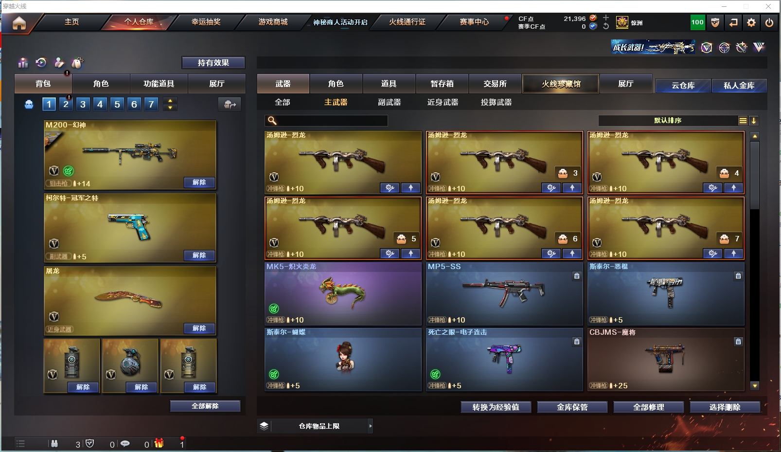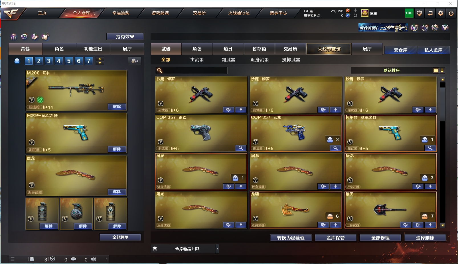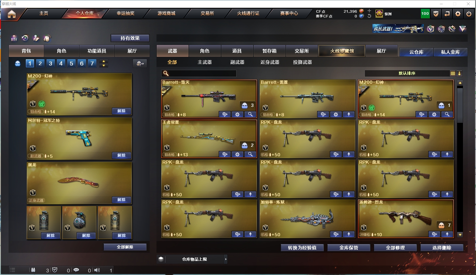 【主 武】:幻神(黄忠)、王者星神、6烈蝴蝶、6盘炼狱、雷霆、白虎、白虎电玩蓝兔、QB云龙、火麒麟(大唐荣光)、雷神(荣耀之魄)、黑骑士(耀金)、QB金色蔷薇、毁灭(耀金)、Brrett雷霆、冰龙粉碎者、机甲撕裂者、激光毁灭者、圣炎切割者、深渊巨龙咆哮、神圣爆裂者、试炼破坏者、苍雷、金魔等各种活动武器