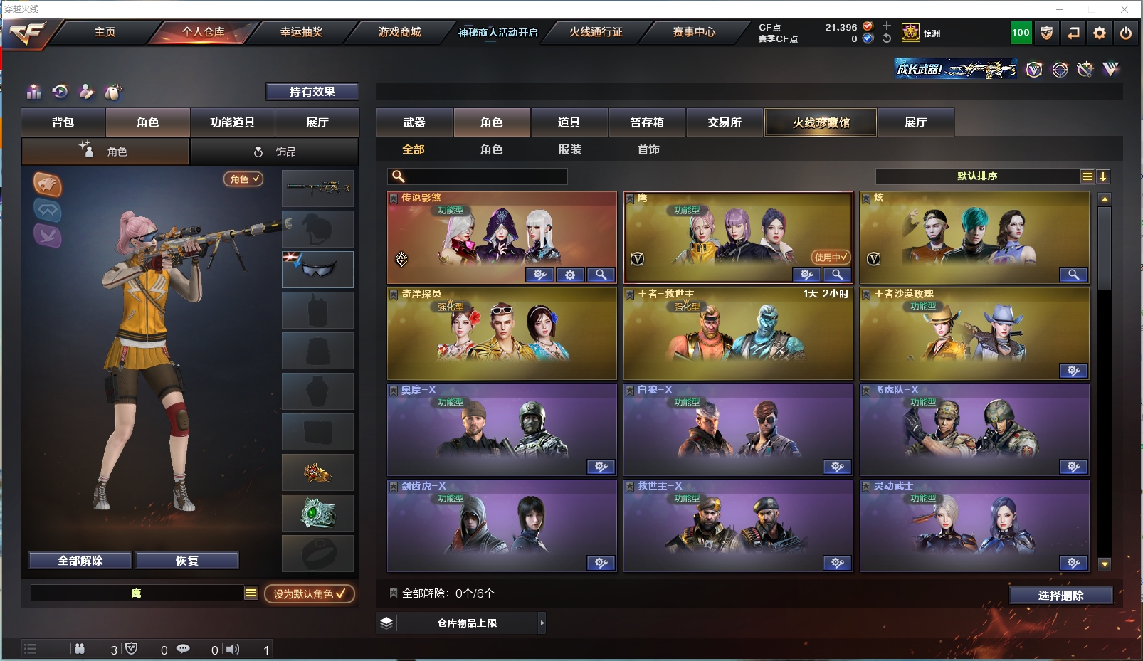 【角 色】:传说影煞、鹰、炫、王者沙漠玫瑰、兔囡囡、风暴女、救世主-X、蜀雪、铁骑荣耀、影舞者-X、8周年戒指、双蛇戒指、双龙戒指