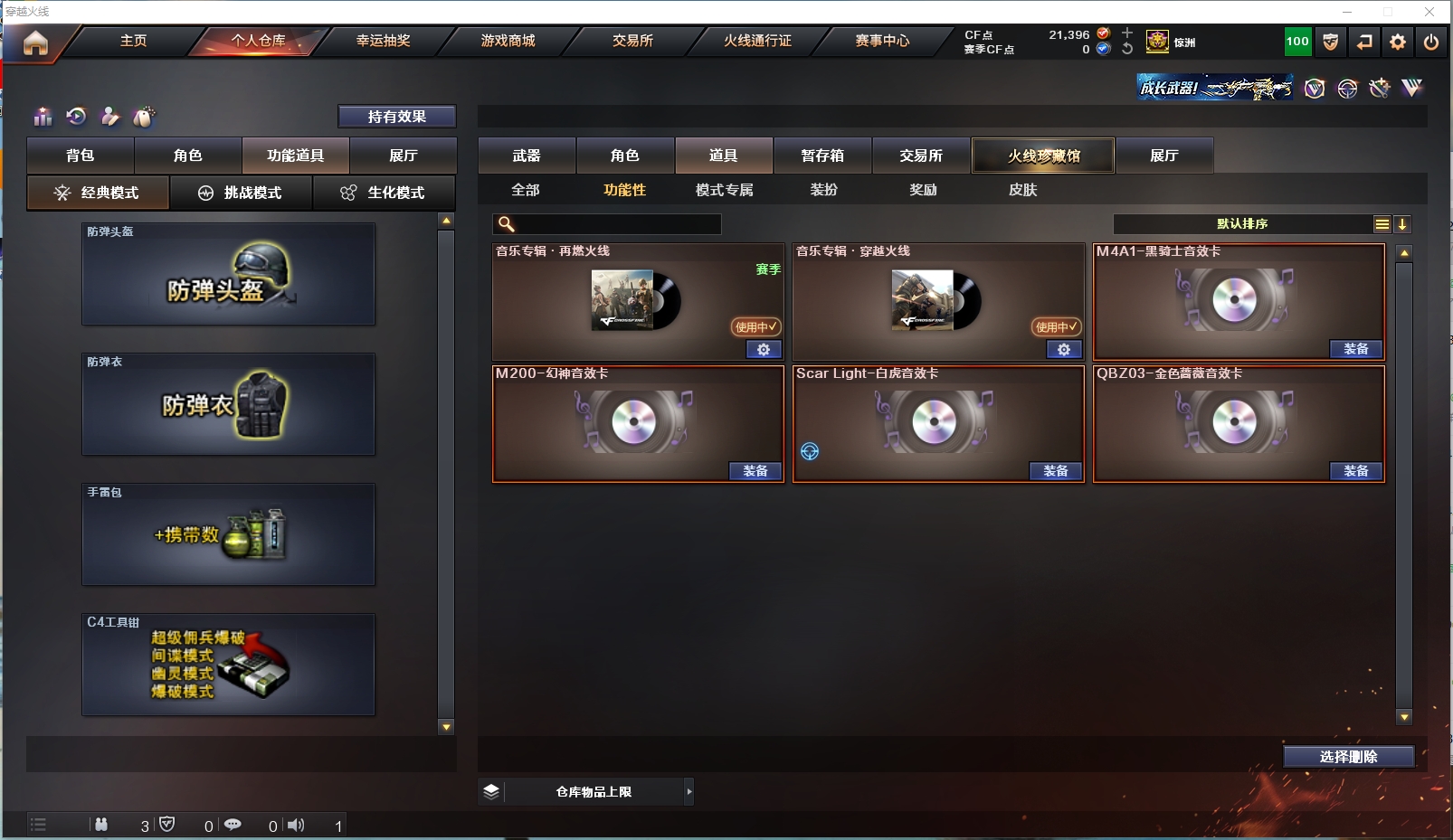 【道 具】:幻神音效卡、黑骑士音效卡、白虎音效、QB金色蔷薇、白泽玩偶、兔子泰迪玩偶、铁骑玩偶、审判者玩偶、关羽玩偶、小红玩偶、7个背包、AC(防弹衣+防弹头盔)、C4工具钳、手雷包、挑战弹夹、夺命之镰、变异宝贝、灵魂忍者、生化弹夹、防化服、机枪弹夹、冲锋枪弹夹、散弹枪弹夹、手枪弹夹、狙击枪弹夹、步枪弹夹、减少停顿包