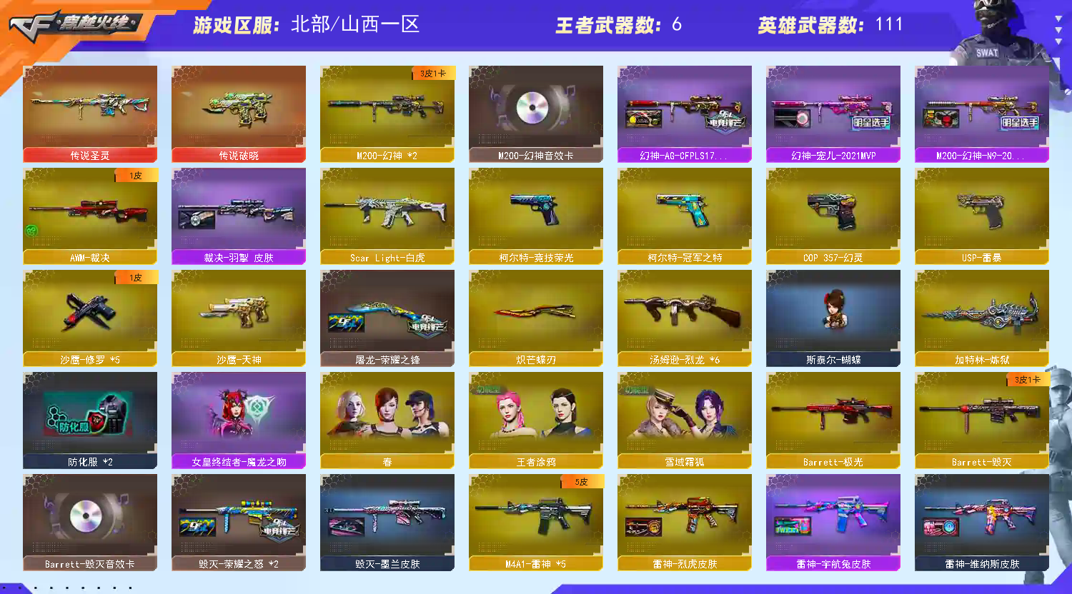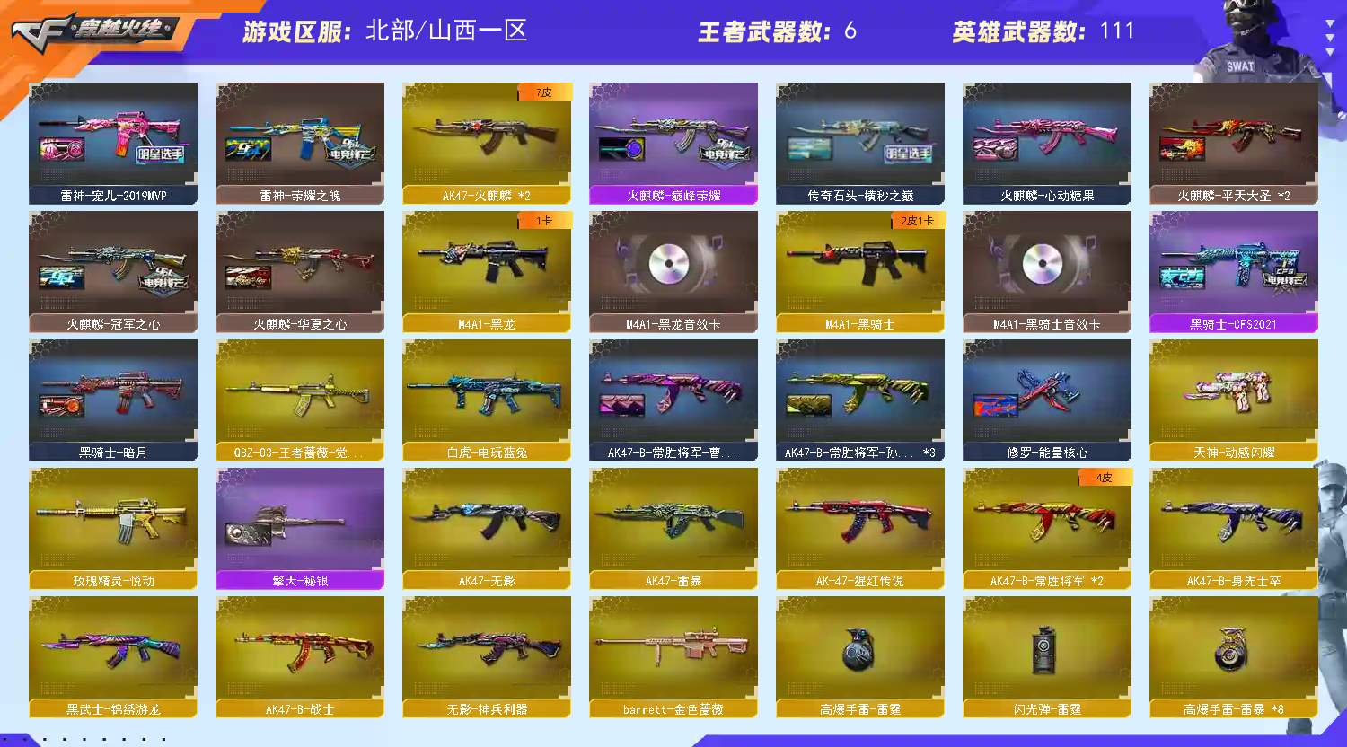 本游戏账号:英雄武器110个; 王者武器7个。 装备不多,但是主武器、副武器、近身武器够用 拥有完美游戏体验。重要的是,特殊装备有:AK47-雷暴、USP-雷暴、AK47-火麒麟、闪光弹-竞技荣光、烟雾弹-竞技荣光、高爆手雷-竞技荣光、柯尔特-竞技荣光、M4A1-雷神、COP 357-幻灵、幻灵之锋、M4A1-黑骑士、传说圣灵、Scar Light-白虎、Barrett-朱雀、M200-幻神、M4A1-黑龙、Barrett-毁灭、加特林-炼狱、QBZ-03-王者蔷薇-觉醒版、炫金雷神、炫金骑士、炫金毁灭、玫瑰精灵-悦动、王者之戮、潘多拉、雷霆-β、堕天使、王者涂鸦、圣诞潘多拉-X、M4A1-黑龙音效卡、M200-幻神音效卡、M4A1-黑骑士音效卡、Barrett-毁灭音效卡、等,随意畅选。