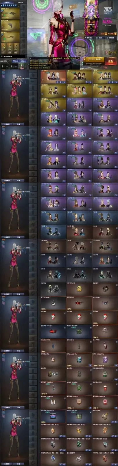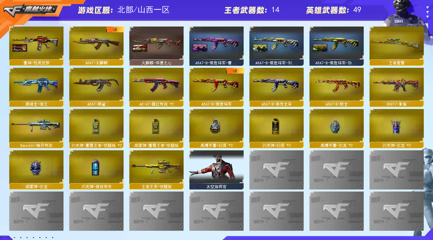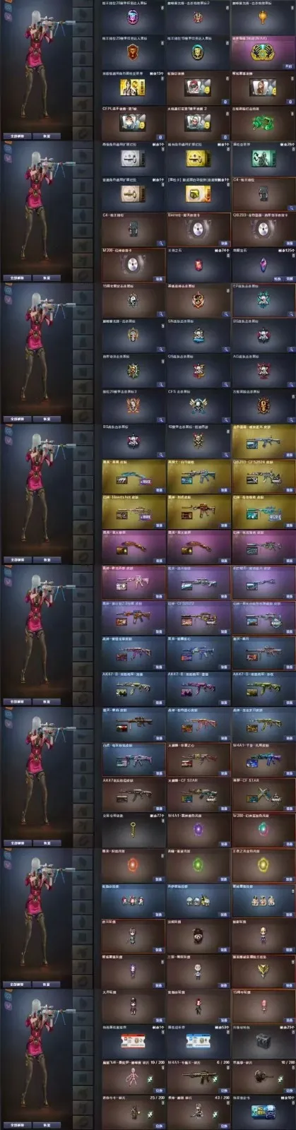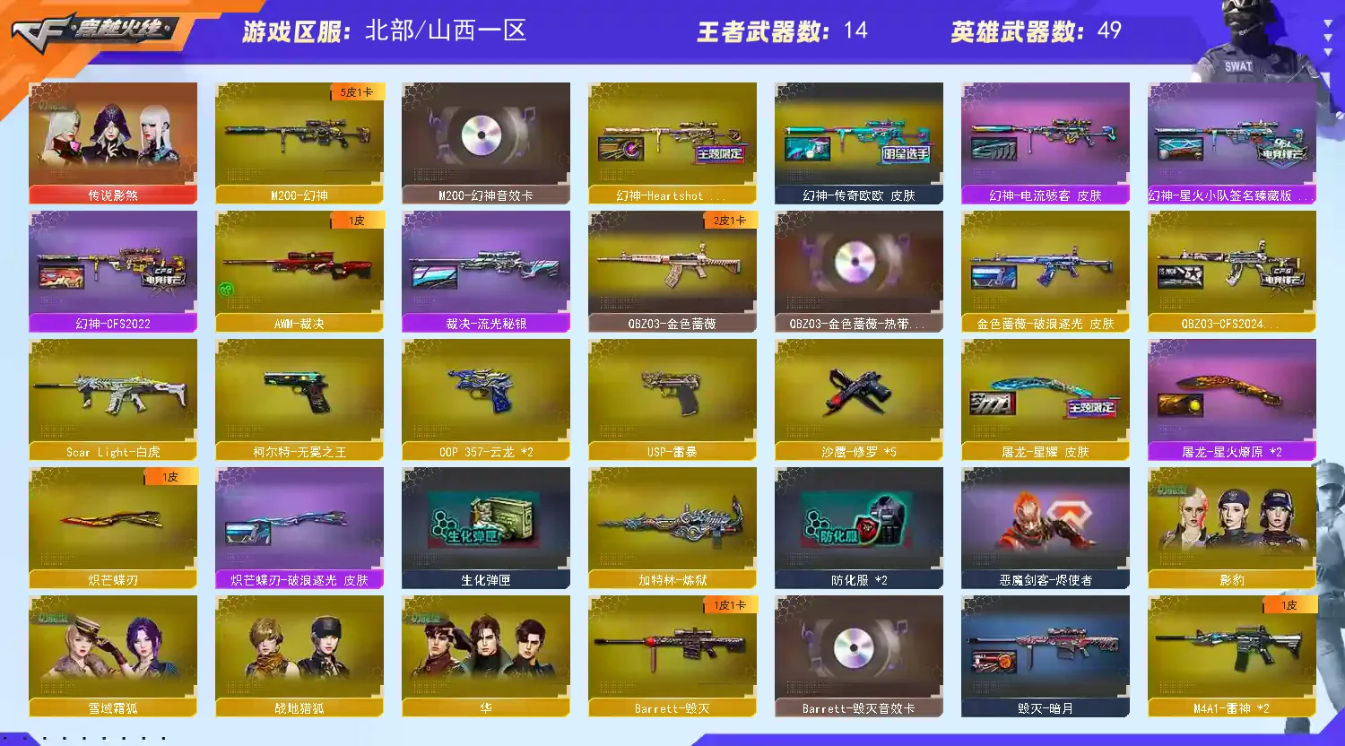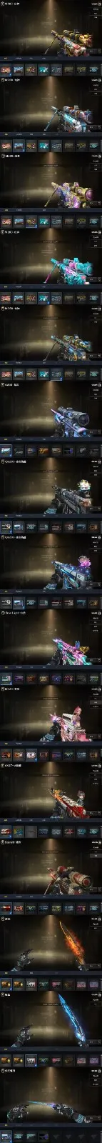 喜欢可以收藏,方便寻找。幻神M200【CFS2022+星火小队+HeartShot+传奇欧欧+电流骇客+音效卡】+王者星霆+QBZ金色蔷薇【CFS2024+破浪逐光+热带奇洋音效卡】+白虎【电玩粉兔】+USP雷暴+COP云龙*2+柯尔特无冕之王+炽芒蝶刃【破浪逐光
