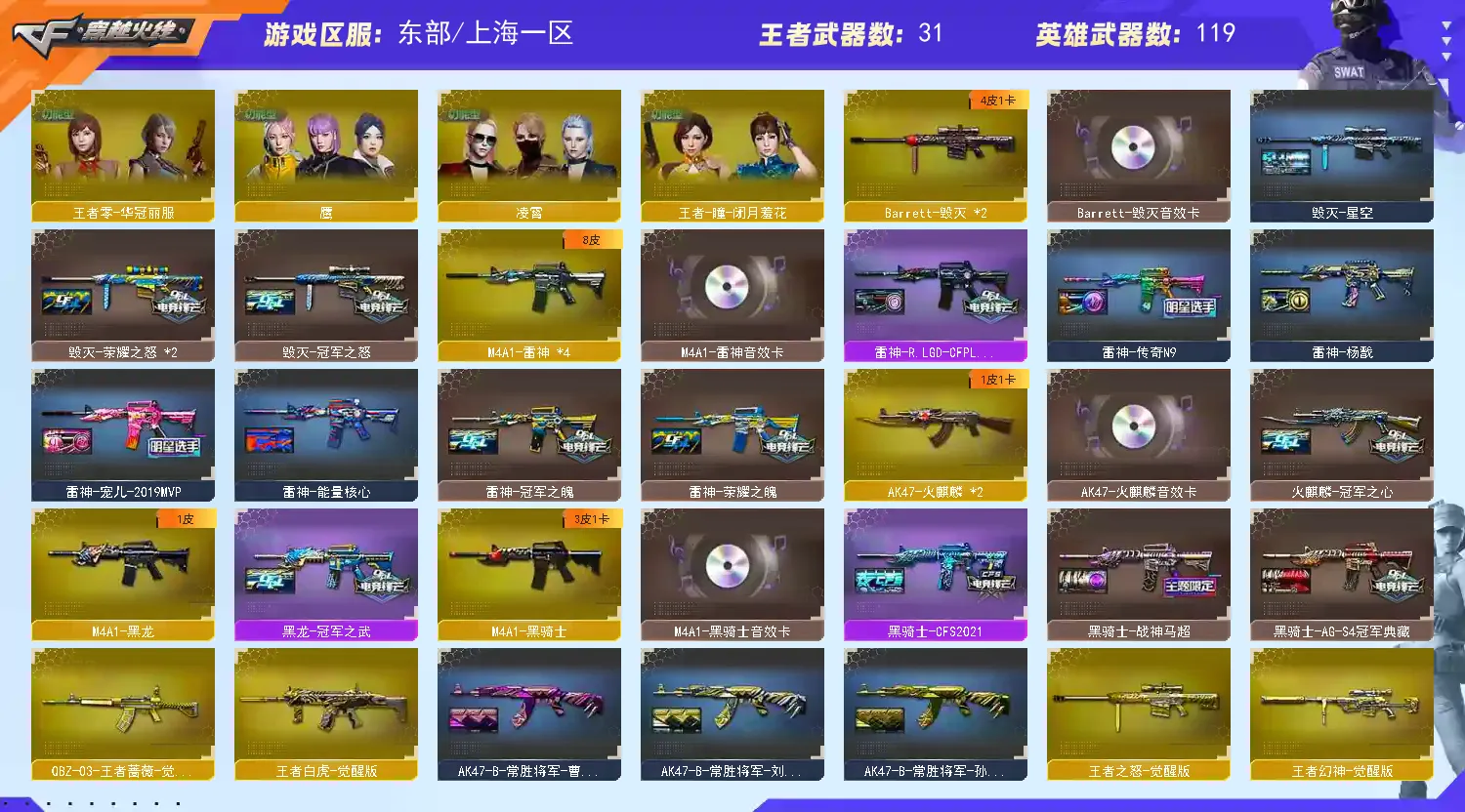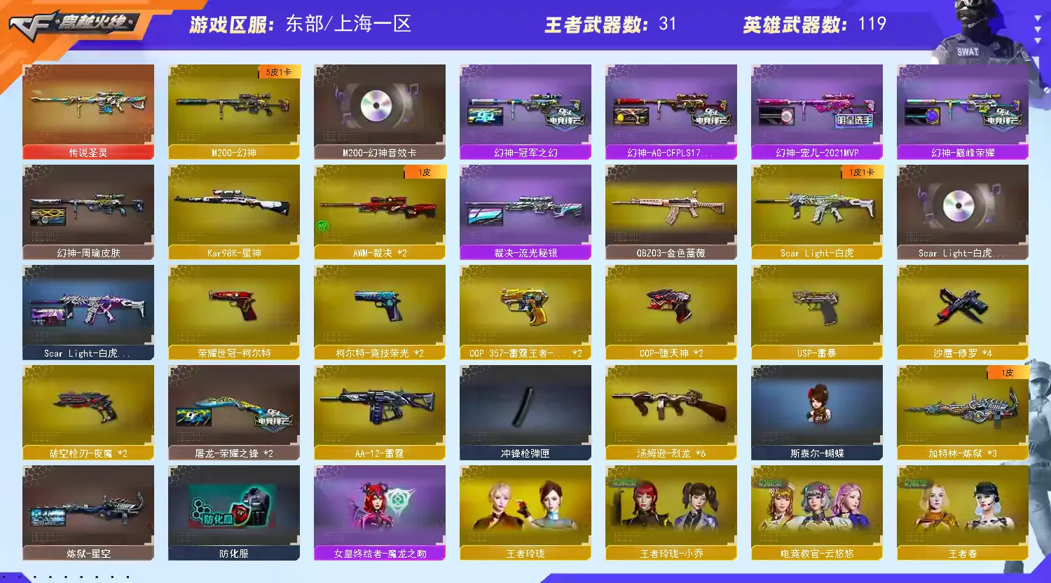 上海一区142V36王者3炫金可排位【幻神三件套带5幻神皮】【荣耀世冠套/雷霆王者套/竞技荣光套/夜魔套/传说圣灵/M200幻神+幻神音效卡+幻神巅峰荣耀+幻神宠儿2021MVP+幻神周瑜+幻神AG17冠军+幻神冠军之幻/王者幻神觉醒/M200竞技荣光+柯尔特竞技荣光+擎天竞技荣光/荣耀世冠火麒麟/荣耀世冠雷神/Kar98K-星神/王者星神觉醒/M4A1-青龙/HK417-朱雀/Scar Light-白虎/王者白虎觉醒/QBZ-03-王者蔷薇觉醒/6烈/斯泰尔蝴蝶/4修罗/2天神/USP雷暴/2把cop-堕天神/2把破空枪刃-夜魔/荣耀世冠-柯尔特/2把COP357-雷霆王者/黄金猫猫手套-白鲨】【毁灭音效卡/火麒麟音效卡/黑骑士音效卡/白虎音效卡/雷神音效卡】【裁决-流光秘银/黑骑士-CFS2021/黑龙-冠军之武/雷神-R.LGD-CFPLS18冠军/Scar Light-白虎-暗星/毁灭-星空/雷神-杨戬/雷神-传奇N9/毁灭-SV-CFPLS16冠军/黑骑士-战神马超/雷神-宠儿-2019MVP/屠龙-荣耀之锋/天龙-CF STAR/火麒麟-CF STAR/毁灭-荣耀之怒/毁灭-冠军之怒/龙啸-冠军之啸/雷神-冠军之魄/火麒麟-CF STAR/修罗-CF STAR/雷神-白鲨-CFPLS14冠军/黑骑士-AG-S4冠军典藏/雷神-荣耀之魄/毁灭-荣耀之怒//炼狱-星空/火麒麟-冠军之心/】【电竞教官-云悠悠/凌霄/鹰/四防王者春/王者瞳-闭月羞花/王者玲珑/四防王者玲珑-小乔/四防王者零-华冠丽服/四防灵狐者-职业经理/王者-零-传说之路/职业选手+白鲨语音包+绝迹语音包/】【M4A1-雷霆王者-觉醒版/Barrett-雷霆王者/雷霆王者之锋/1套雷暴雷/1套堕天神雷/7套夜魔雷/2套竞技荣光雷/1套雷霆王者雷/1套王者之魄手雷/火麒麟绝迹/COP-白鲨