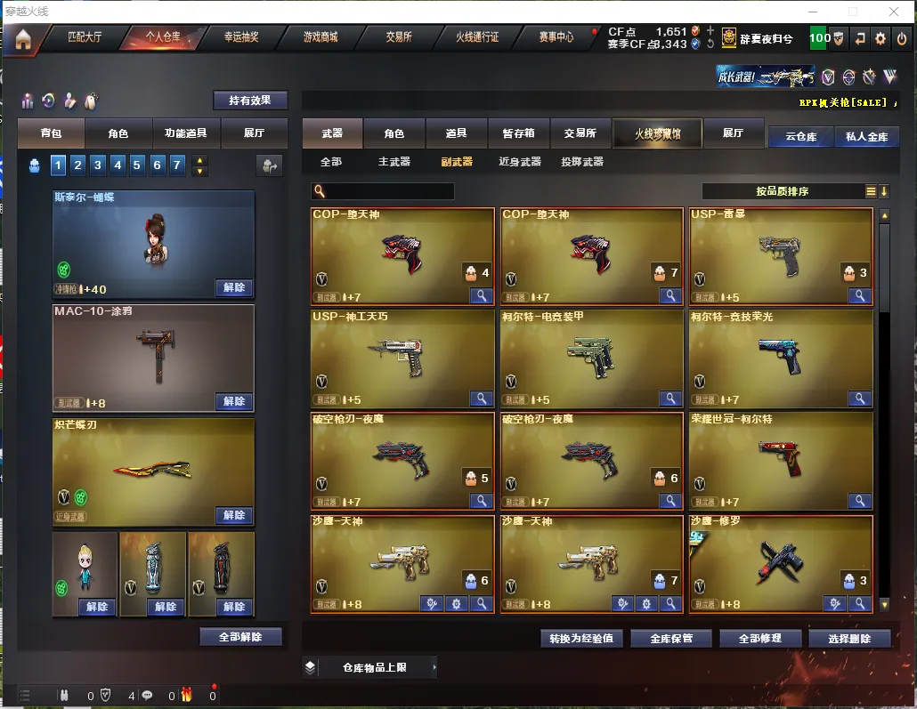 【副武器】②COP-堕天神/柯尔特-荣耀世冠/柯尔特-竞技荣光/玄豹左轮/USP-神功天巧/USP雷暴/②破空枪刃夜魔/③修罗/②天神/电竞装甲柯尔特/王者之灵觉醒/COP旗袍/⑤涂鸦手枪