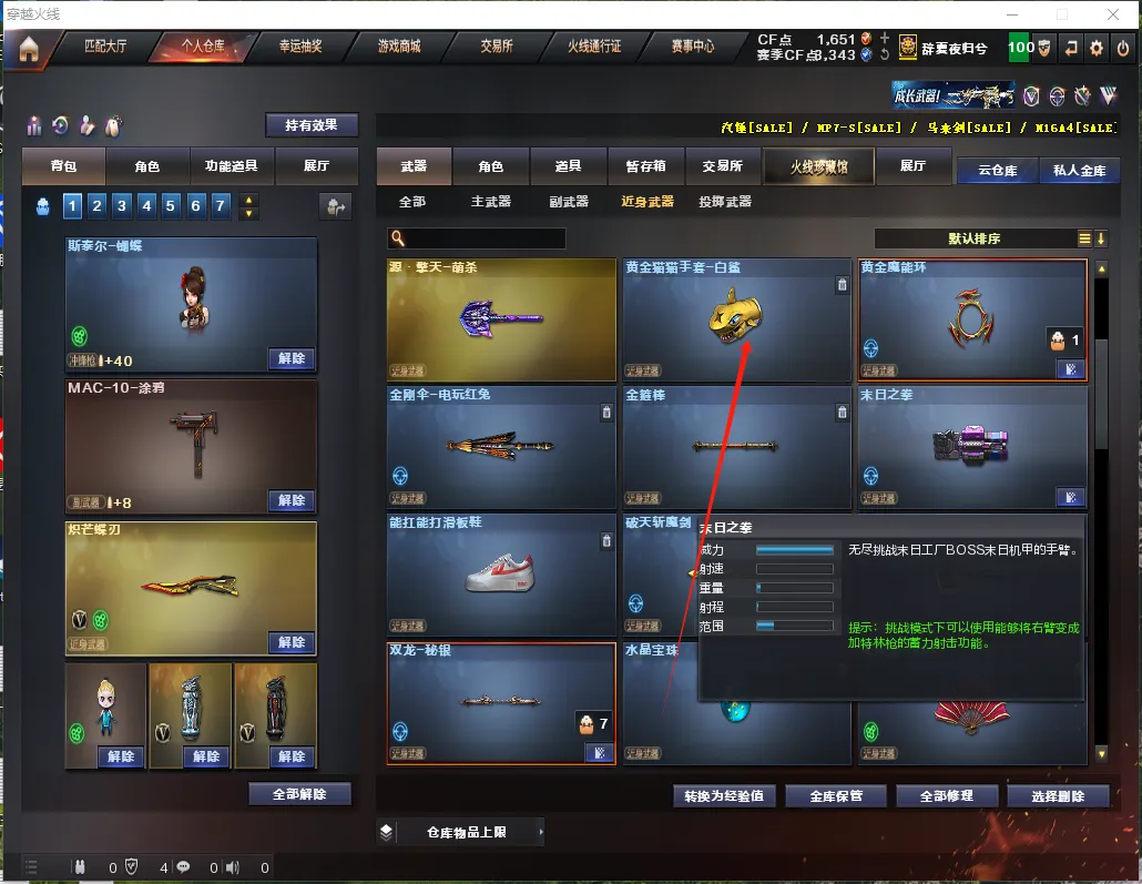 【近身武器】炽芒蝶刃/黄金猫猫手套白鲨/玄豹匕首/王者冰峰/3屠龙/龙啸/擎天/麒麟刺/马来剑夜魔/电竞装甲尼泊尔/擎天竞技荣光/屠龙动感闪耀/擎天云海游龙/屠龙云海游龙/龙啸热带奇洋/王者之峰觉醒/王者之刺觉醒/王者玉峰觉醒/荣耀是冠-龙啸/黄金尼泊尔/迷你牛牛/冰龙/博士/裂空之翼/②手斧镜/