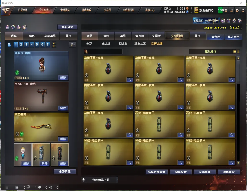 【投掷武器】②迷你生化手雷/④套玄豹投掷/⑦高爆堕天神+⑦烟闪/⑦恶棍电竞装甲+⑦烟闪/