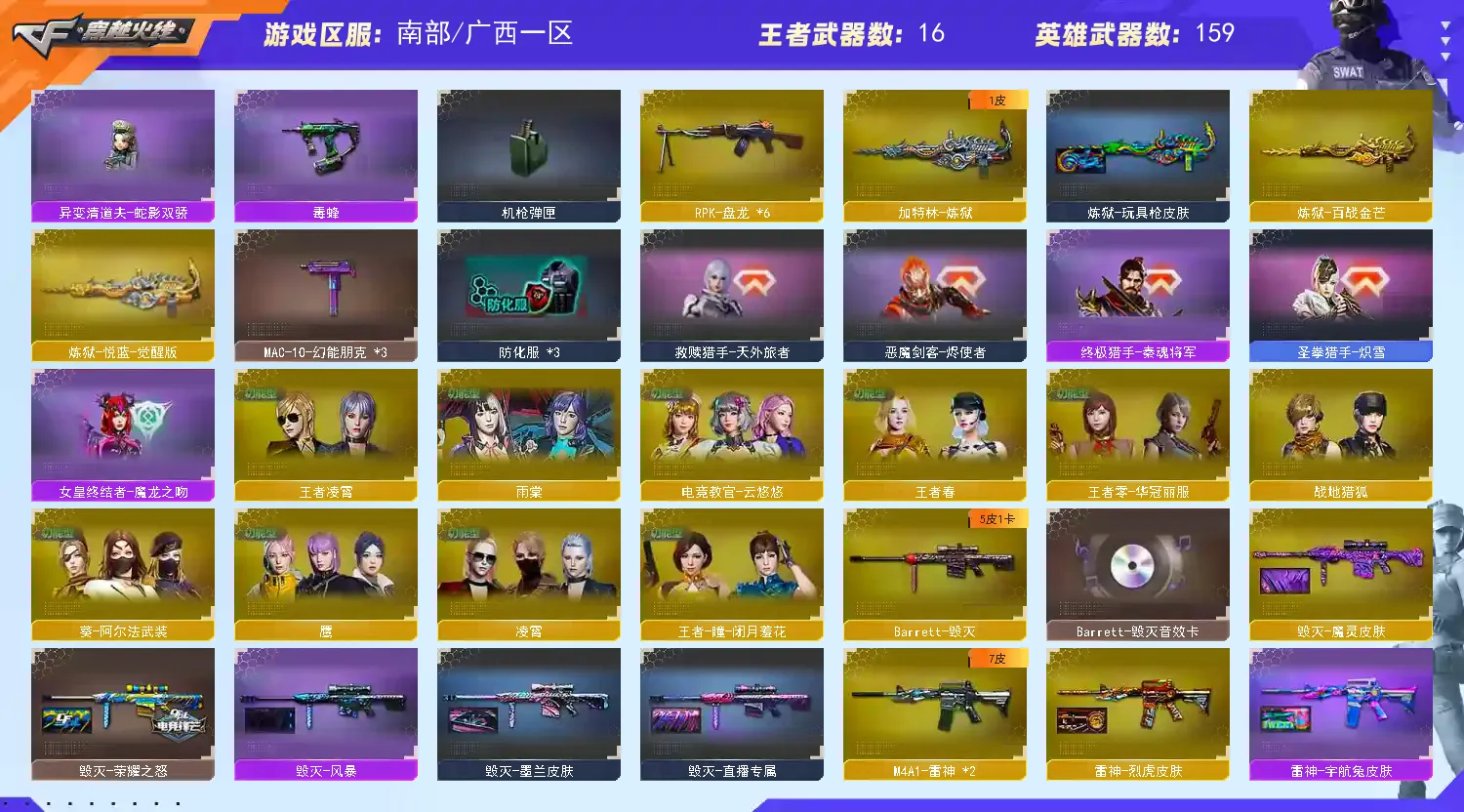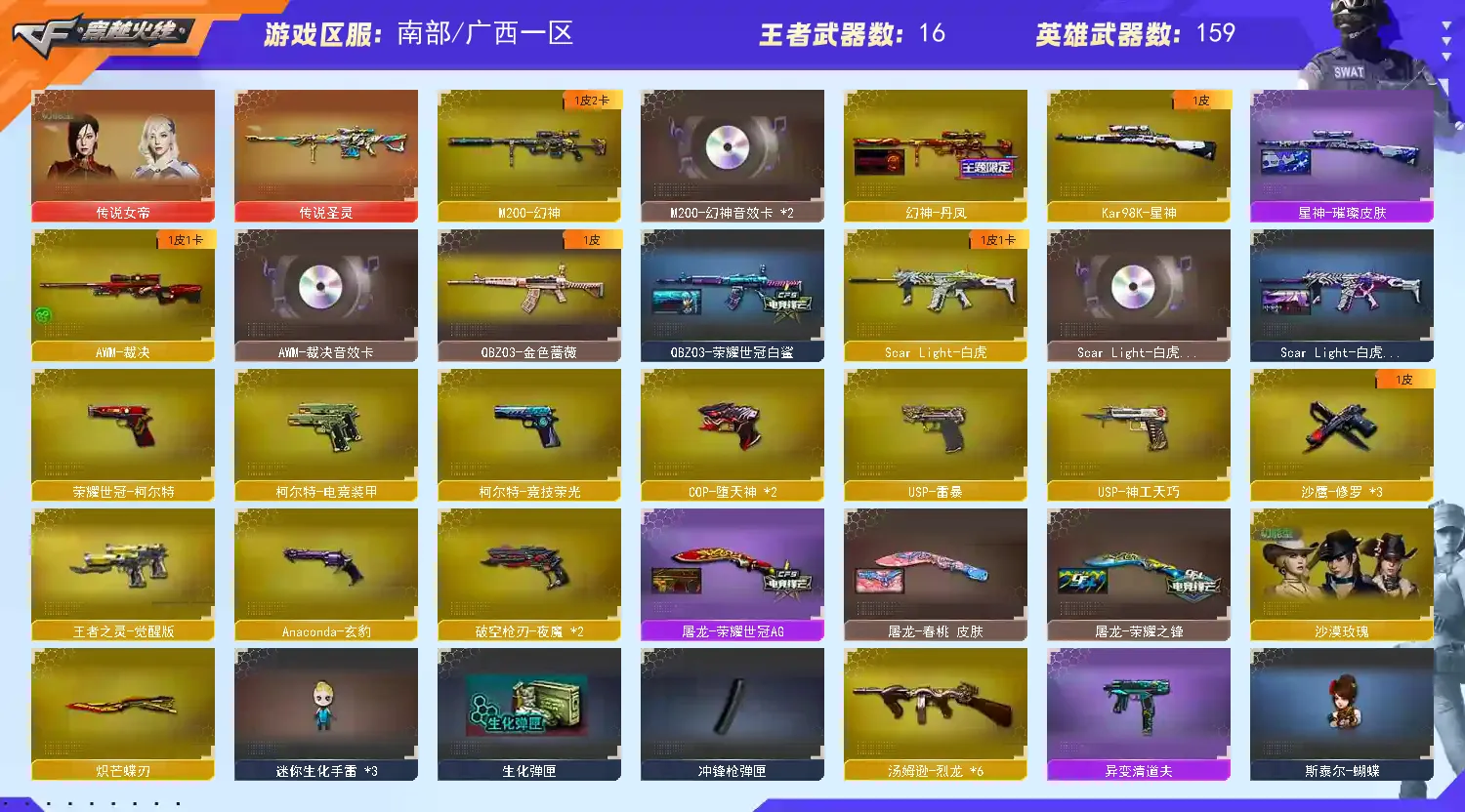 【皮肤】幻神-丹凤皮肤/蔷薇qbz-荣耀世冠白鲨皮肤/屠龙-春桃+荣耀之峰+荣耀世冠AG皮肤/火麒麟-巅峰荣耀+荣耀世冠AG+盘古+大唐荣光+百城皮肤/毁灭-荣耀之怒+CFS2018+格林姐妹皮肤/擎天-冠军之击皮肤/雷神-荣耀世冠AG+荣耀之魄+冠军之魄+宠儿皮肤/白虎-暗星皮肤/裁决-百城天津皮肤/黑骑士-冠军之势皮肤/黑龙-墨子皮肤/修罗-冠军之魂皮肤/