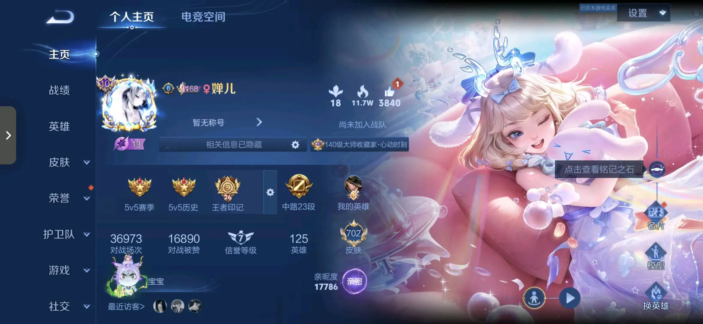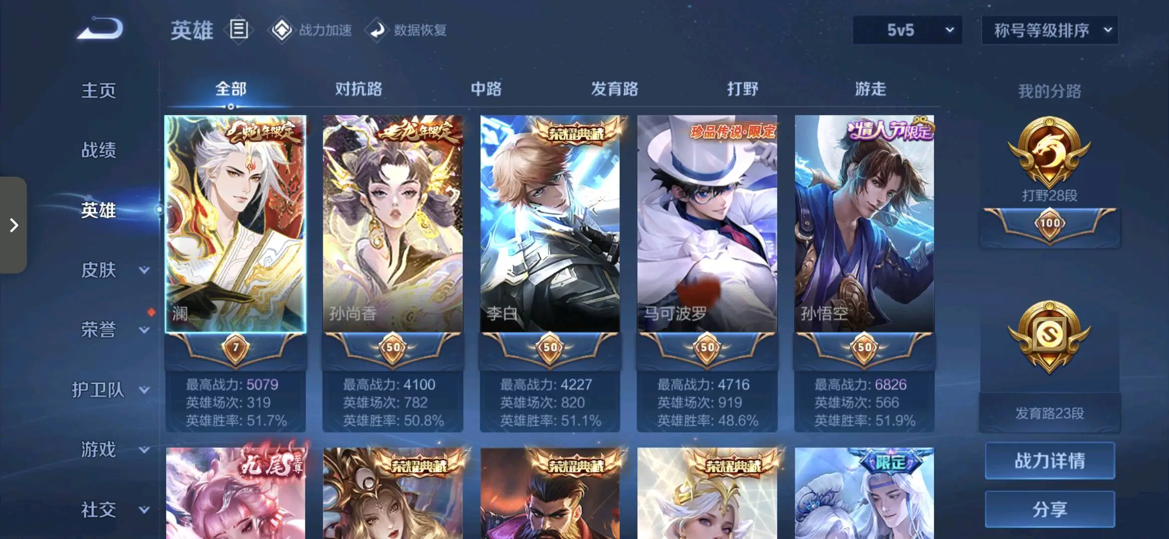 贵族等级V10无双贵族,英雄数量127,典藏皮肤数19,皮肤数量778,冰锋战神/街头霸王/天鹅之梦/纯白花嫁/天魔缭乱/至尊宝/杀手不太冷/真爱至上/圣诞老人/王者之锤/大秦宣太后/凤求凰/热情桑巴/逐梦之影/武陵仙君/神奇女侠/星空梦想/梅西/无限飓风号/黄金狮子座/一生所爱/全息碎影/大圣娶亲/冰霜恋舞曲/青龙志/白虎志/朱雀志/活力突击/太华/久胜战神/飞衡/梁祝/倪克斯神谕/白鹤梁神女/匿光追影者/鸣剑·曳影/遇见胡旋/龙胆/星域神启/李逍遥/武圣/奔雷神使/孙行者/玉兔公主/补天/异界灵契/神威/启示之音/傲雪梅枪/淬星耀世/时雨天司