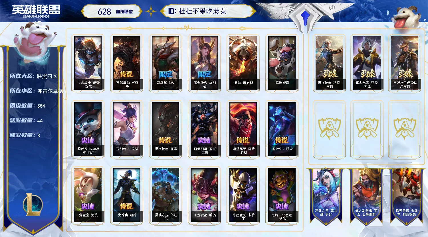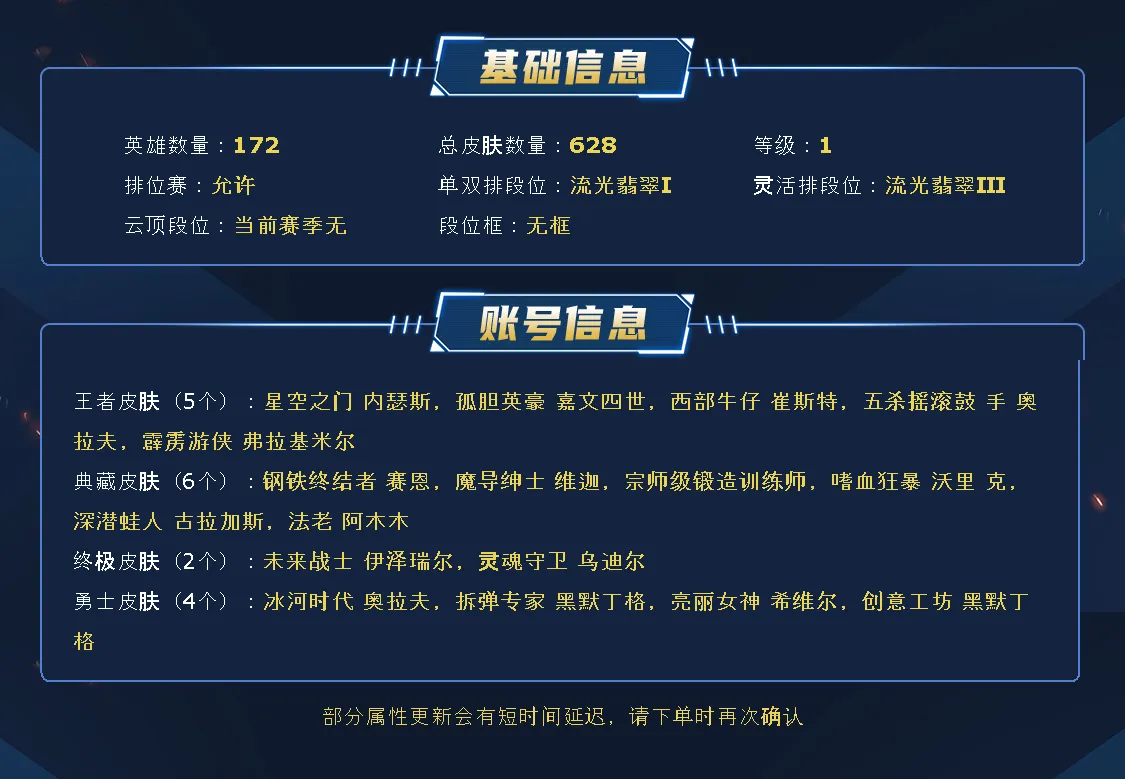 联盟四区丨弗雷尔卓德丨全英雄丨622总皮丨可排位丨可炸鱼丨未来战士丨灵魂守卫丨至臻凯隐丨请勿挂机谢谢