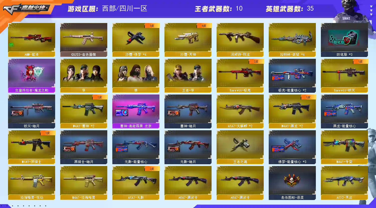 双全装|6炼狱+王者炼狱+四防王者零+佣兵觉醒+捕食者之眼+全弹夹|觉醒王者翼戮魂锋啸魄心|雷神高能霹雳皮肤|裁决|qbz金色蔷薇|千变|无影|黑龙|黑骑士|黑武士|激光|天启|火麒麟|天龙|死神|无影|烈龙|玫瑰精灵|天神|修罗|龙啸|擎天|零葵樱|生化爆破全装