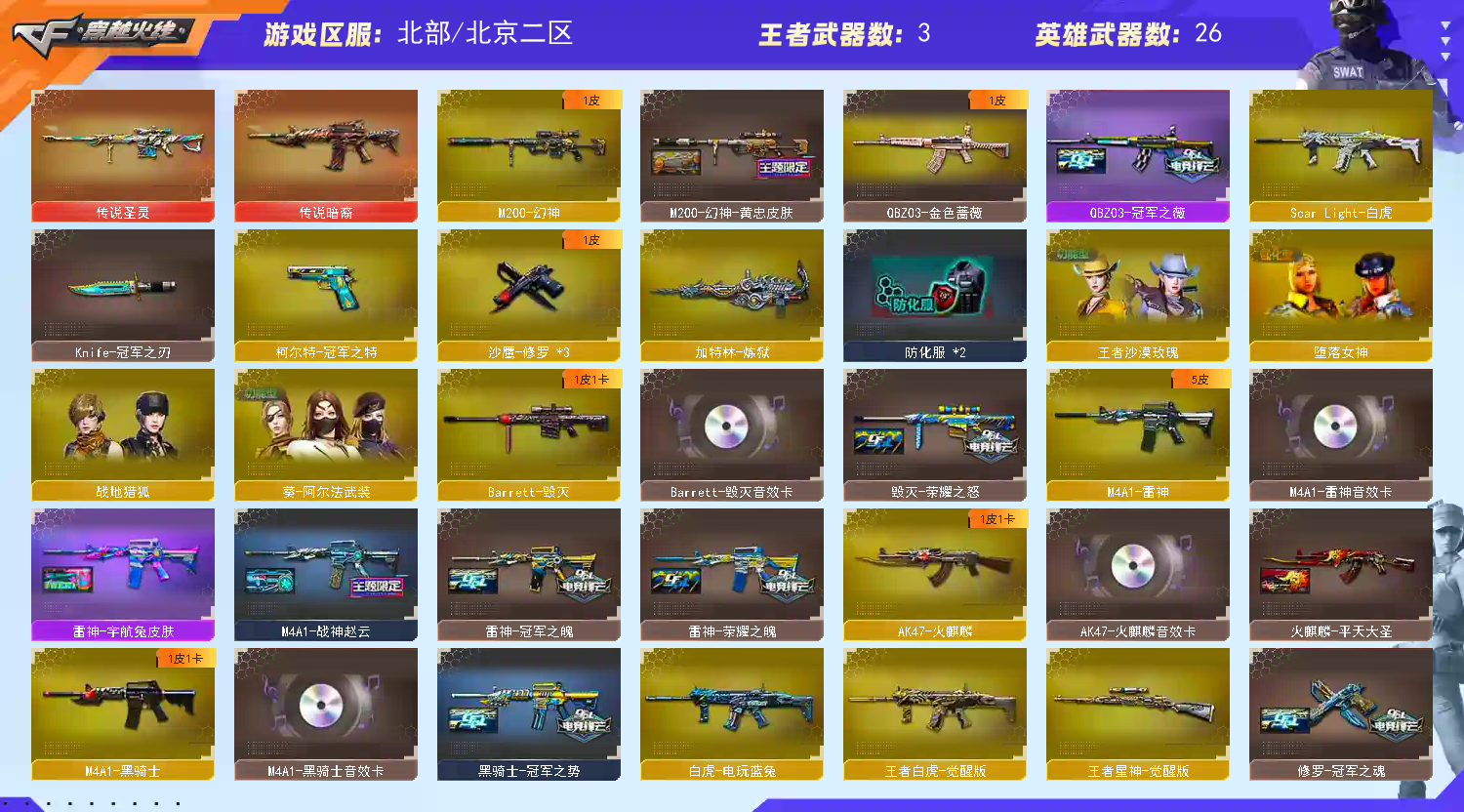 【m200-幻神+幻神-黄忠】 【王者星神】 【传说圣灵】 【传说暗裔】 【王者白虎】 【scar白虎】 【qbz金色蔷薇+冠军之薇】 【火麒麟+音效卡+火麒麟-呛娘】 【麒麟】 【雷神+音效卡+雷神-冠军之魄+雷神-荣耀之魄】 【黑骑士+音效卡+黑骑士-冠军之势】 【毁灭+音效卡+毁灭-荣耀之怒】 【王者火魄】 【超新星】 【4手呛 修罗*3 冠军之特】 【2近战 屠龙 麒麟刺】 【四防 王者沙漠玫瑰】 【角色 战地猎狐 堕落女神 乔伊教练】