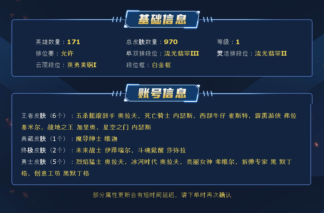 【全英雄可排位600原皮肤】至臻奎桑提、至臻DRX剑魔、至臻剑圣、至臻希维尔、至臻辛德拉、至臻狗熊、至臻日女、至臻皎月、至臻佐伊、至臻卡莎、至臻婕拉、至臻锐雯、至臻锤石、至臻EZ、至臻塞拉斯、海克斯乌鸦、海克斯皇子、黎明使者卡尔玛、玉剑泽丽、蛇年阿木木、牛年牛头、玉剑刀妹、灵能特工易、电玩锐雯、龙琴、虎痴之拳、猴年猴子、殿堂传奇卡莎、殿堂传奇薇恩、殿堂传奇妖姬、斗魂觉醒莎弥拉、黎明永恩、源计划鳄鱼、女帝卡特琳娜、神龙尊者盲僧、双城之战大头、泳池瑟提、泳池辛德拉、情人节男刀、情人节乌鸦、征服者贾克斯、征服者牛头、征服者韦鲁斯、EDG厄斐琉斯、热狗纳亚菲利、最高清算德莱文、最高清算赛恩、最高清算男刀、正义假面卢锡安、正义假面永恩、黑色玫瑰假面舞会吸血鬼、黑色玫瑰假面舞会莎弥拉、黑色玫瑰假面舞会烈娜塔、战场BOSS卑尔维斯、黑夜皇子、黑夜蛮王、黑夜莉莉娅、暗星泽拉斯、冲击之刃奇亚娜、狗粮克烈、小蜜蜂发条、太空律动丽桑卓、太空律动努努、太空律动拉克丝、玉剑琴女、巅峰之星李青、秩序之舌塔姆、神龙尊者卡尔玛、魔女蛇女、日蚀骑士猪妹、食日天使凯尔、破败军团德莱文、破败军团女枪、破败军团潘森、源计划塞拉斯、青花瓷阿木木、咖啡甜心安妮、咖啡甜心格温、咖啡甜心希维尔、光明哨兵刀妹、山海绘卷大虫子、女帝奇亚娜、新KDA阿狸、新KDA卡莎、神龙尊者寒冰、灵能特工派克、灵能特工蔚、灵魂莲华蛇女、水瓶星神、狮子星神、天蝎星神、波江星神、黑暗骑士赵信、龙族卫士、五杀摇滚铁男、五杀摇滚之噪音佛耶戈、未来战士EZ、伯爵卡萨丁、星之守护者芮尔、泳池发条、泳池女警、泳池岩雀、暗星女王拉克丝、暗星尊烬、奥德赛凯隐、神拳、神王诺手、神王盖伦、屠龙勇士潘森、西部卢锡安、西部寒冰、西部赛娜、星守洛、星守霞、源计划派克、源计划寒冰、源计划薇恩、战斗学院EZ、真实伤害艾克、至尊魔女莫甘娜、黯晶战神、柯基库奇、黎明豹女、喵凯、绒毛菲兹、未来战士卡牌、未来战士剑姬、未来战士慎、武神、西部锤石、西部人马、西部诺手、小恶魔小炮、永恒之森沙皇、永恒之森霞、宇航员凯南、宇航员茂凯、宇航员泽拉斯、玉剑娜美、玉剑锐雯、源计划刀妹、战斗男枪、战斗杰斯、战斗卡特、真实伤害奇亚娜