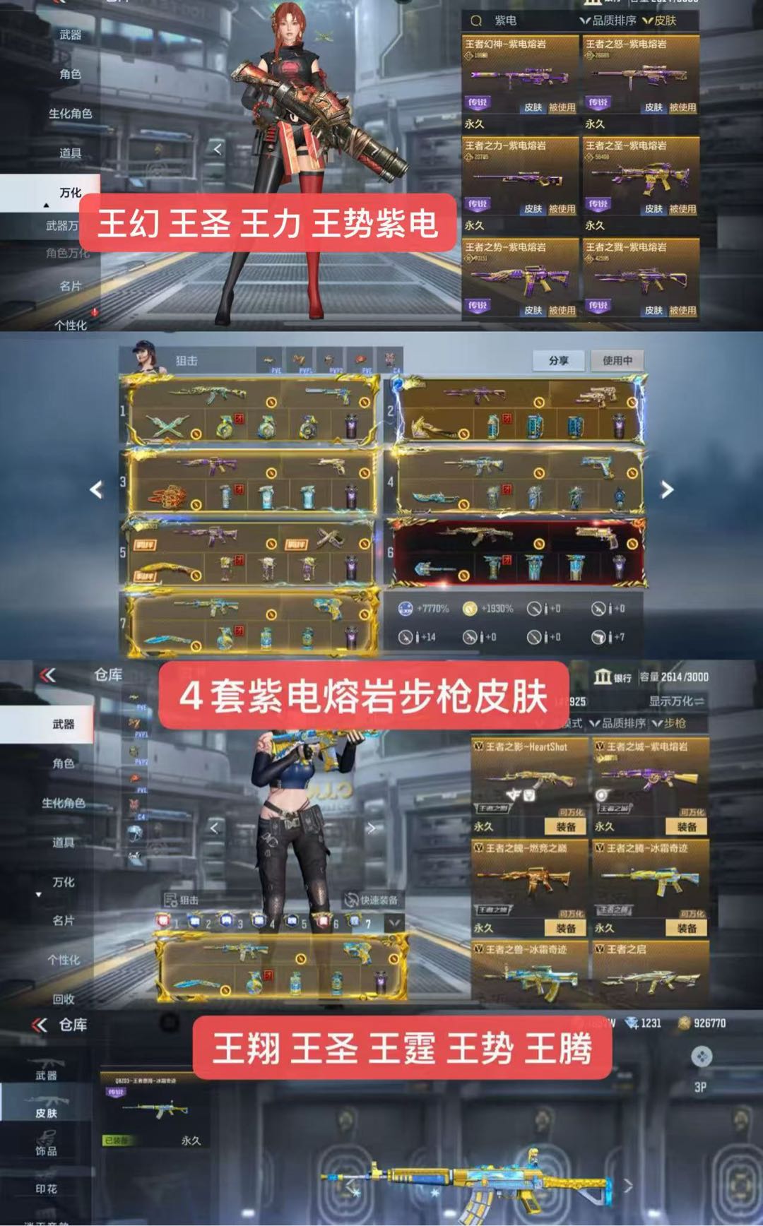 本游戏账号:英雄武器284个, 王者武器6个。军衔: 荣耀元首,段位: 传奇,拥有:王者-零,樱,云悠悠,等5个角色。装备齐全让你拥有完美游戏初体验,特殊装备有:手斧-竞技战魂、QCW05-变形金刚·大黄蜂、王者之掣、AA12-竞界荣光、手雷-竞界荣光、VEPR12-本初、COP 357-雷霆、CZS2-心动次元、AK47-血武士、81式-阿波罗、巴雷特-雷神、斯泰尔-蝴蝶、KSG-黑骑士、M12S-雷霆、AN94-超新星、MK23-幻神、TAC-慈、闪光弹-雷暴、烟雾弹-竞界荣光、AWM-游骑兵、A180-地狱凤凰、机械纪元闪光弹、KSG-孟获、M200-心动次元觉醒、9A91-游骑兵、黑龙魂、幻兽闪光弹、机械纪元手雷、M200-心动次元、MG36-黑骑士、G36-竞技战魂、闪光弹-竞界荣光、M14EBR-天神、闪光弹-雷霆、雷神闪光弹、M12S-雷霆王者、MK5-机械纪元、AK47-麒麟、KAC-变色龙、MK47-机械纪元、墨刃-幻神、M4A1-海骑士、AK47-心动次元觉