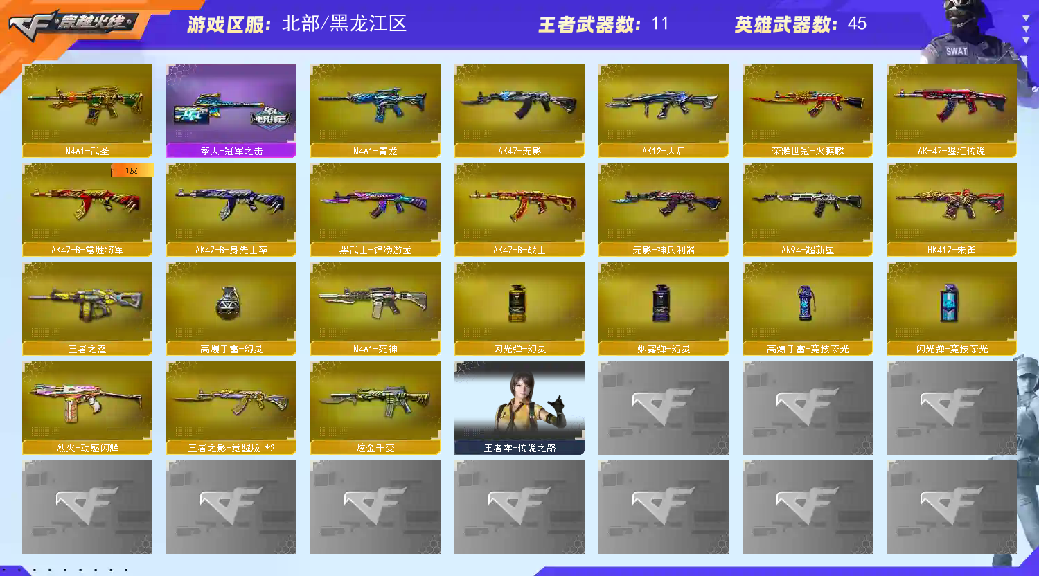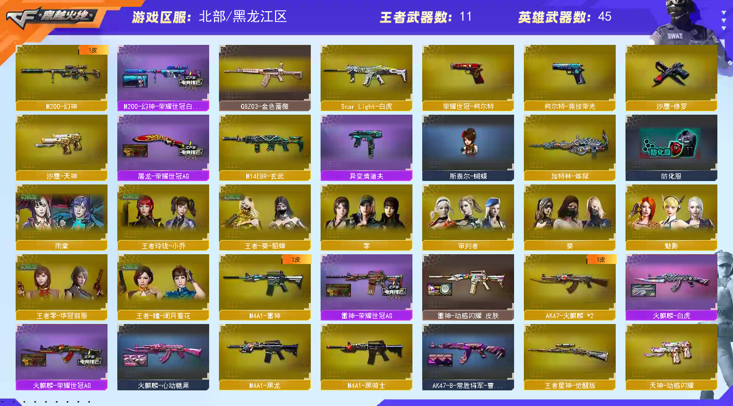 北部黑龙江区【幻神➕幻神世冠白鲨➕王者星神】王者葵瞳零羽裳影豹白虎朱雀青龙玄武荣光柯尔特世冠套开黑必备可排位本游戏账号:英雄武器43个; 王者武器8个。 装备不多,但是主武器、副武器、近身武器够用 拥有完美游戏体验。重要的是,特殊装备有:M200-幻神、AK47-火麒麟、柯尔特-竞技荣光、HK417-朱雀、加特林-炼狱、闪光弹-竞技荣光、擎天-竞技荣光、荣耀世冠-龙啸、荣耀世冠-火麒麟、荣耀世冠-柯尔特、王者之霆、王者之锋-觉醒版、火麒麟-暗月、魅影、王者玲珑-小乔、王者-瞳-闭月羞花、堕天使、王者-葵-貂蝉、等,随意畅选。