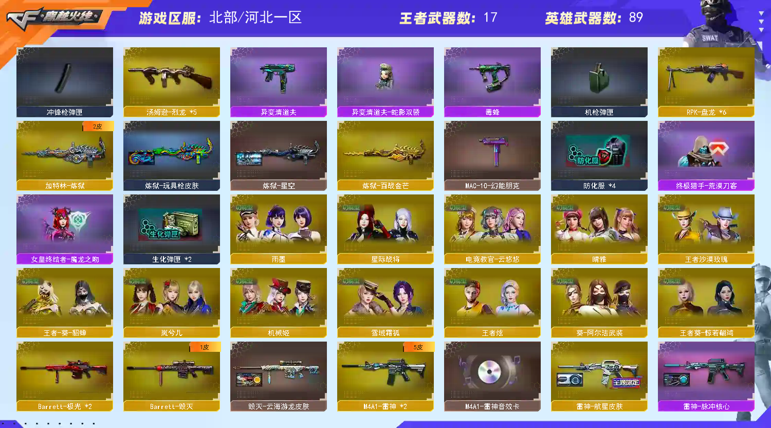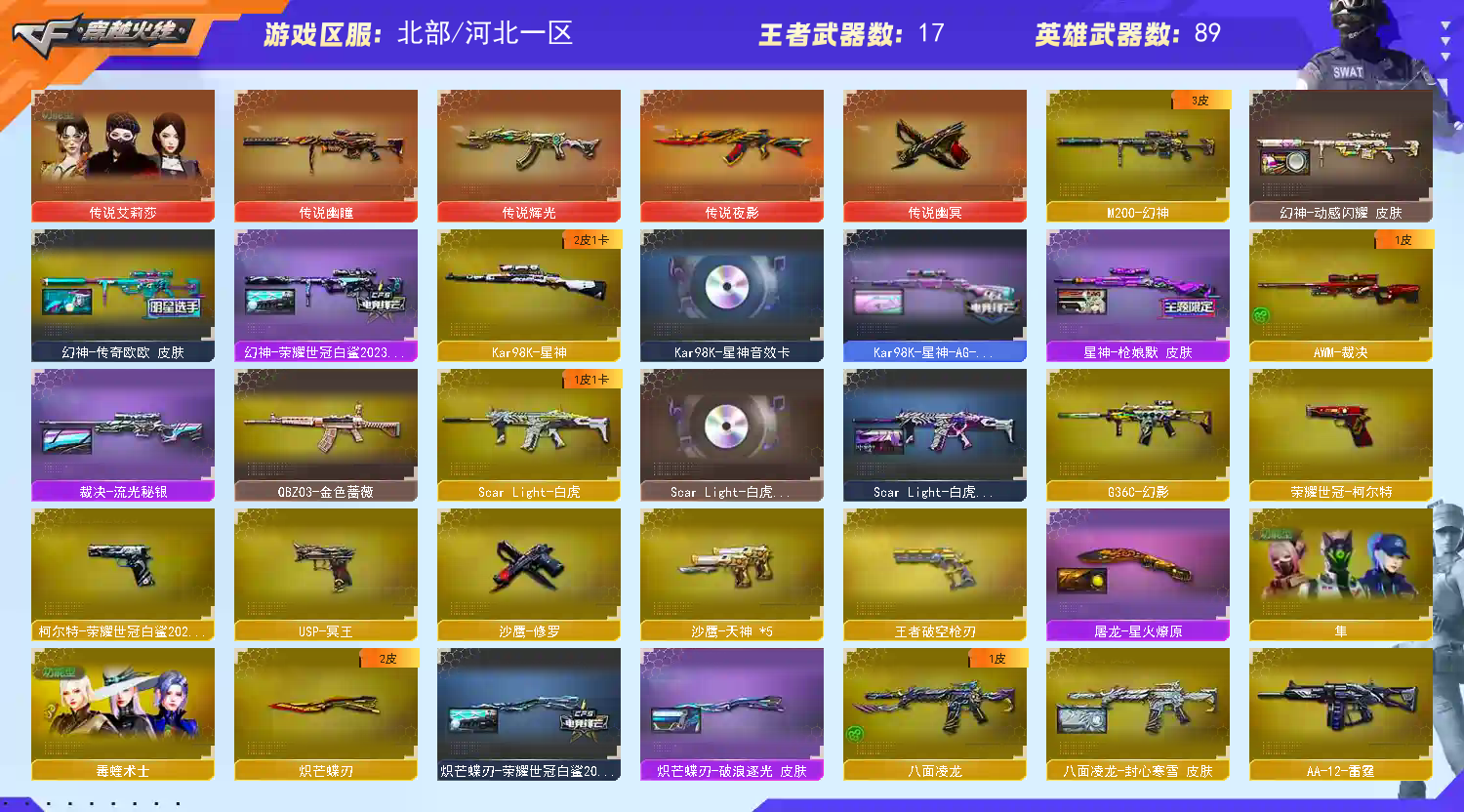 4防艾莉莎4防毒蝰术士4防隼4防云悠悠4防晴雅4防岚兮儿五传说幽瞳传说辉光传说夜影传说幽冥传说艾莉莎满级八面玲珑(封心寒雪)G36C幻影天罚银翼幻神(传奇欧欧/世冠白鲨)白虎三件套星神三件套(枪娘默/AG冠军)裁决流光秘银6烈龙6盘龙蝴蝶斯泰尔异变清道夫-蛇影双骄/毒蜂/异变清道夫/2世冠柯尔特蝴蝶刀(世冠白鲨/破浪逐光)USP冥王
