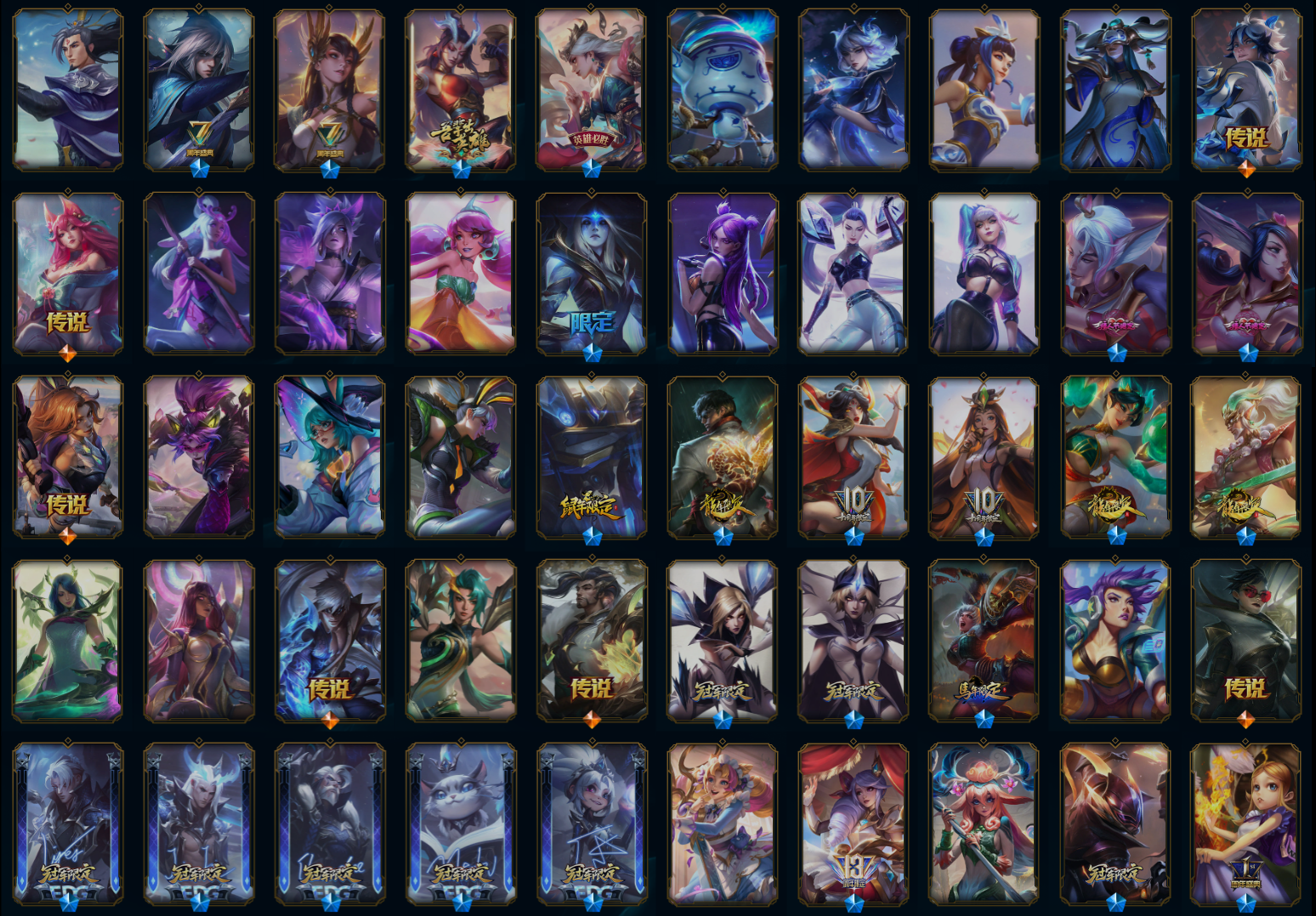 【传说皮肤】暗星锤石 西部天使赛娜 日蚀骑士希维尔 天煞劫 第三类接触黑默丁格 源计划超体莫德凯撒 暗星尊烬 恶魔男爵瑞兹 红色男爵库奇 屠龙勇士潘森 金牌主播德莱文 蔷薇绅士杰斯 战斗学院凯特琳 源计划林易 灵能特工娑娜 神王盖伦 战场女武神凯尔 女警狙击凯特琳 神龙尊者昼日真龙亚索 太空律动律动队长提莫 源计划毁灭派克 银河魔装机神兰博 星之守护者金克丝 电玩女神娑娜 黎明使者锐雯 幻灵战斗队长厄运小姐 真实伤害艾克 上古战魂魔腾 星之守护者阿卡丽 灵魂莲华阿狸 约德尔国队长提莫 地狱之门卫士加里奥 光明哨兵格雷福斯 黎明使者永恩 黯晶凤凰艾尼维亚 青花瓷伊泽瑞尔 冰川巨兽墨菲特 魔女伊芙琳 鬼魂新娘莫甘娜 死亡骑士盖伦 战地巨兽科加斯 光明哨兵薇恩 双重冰晶艾尼维亚 太空律动猫猫布里和里茨 西部魔影卢锡安 星之守护者卡莎 陆地王者4WD布里茨 黎明使者索拉卡 苍穹之光韦鲁斯 女校长菲奥娜 星之守护者霞 星之守护者洛 星之守护者阿狸 合金巨兽努努和威朗普 战斗学院伊泽瑞尔 炼狱魔犬内瑟斯 钢铁之翼凯尔 大天使长米迦勒凯尔 奥德赛凯隐 暗星女王拉克丝 冰霜亚龙希瓦娜 铁哥们儿奥拉夫 女皇艾希 钢铁军团盖伦 黑夜使者亚索 月蚀骑士蕾欧娜 神龙尊者圣龙李青 腥红之月鬼武姬阿卡丽 霸天异形卡兹克 源计划联合艾希 神王德莱厄斯 偶像歌手阿狸 律政大亨蒙多 冰霜之刃艾瑞莉娅 泳池派对吉格斯 魔幻卡牌崔斯特 战地机甲厄加特 烈焰雄心崔丝塔娜 黯黑魔龙希瓦娜 宇航员诺提勒斯 焰尾妖狐阿狸 绅士科加斯