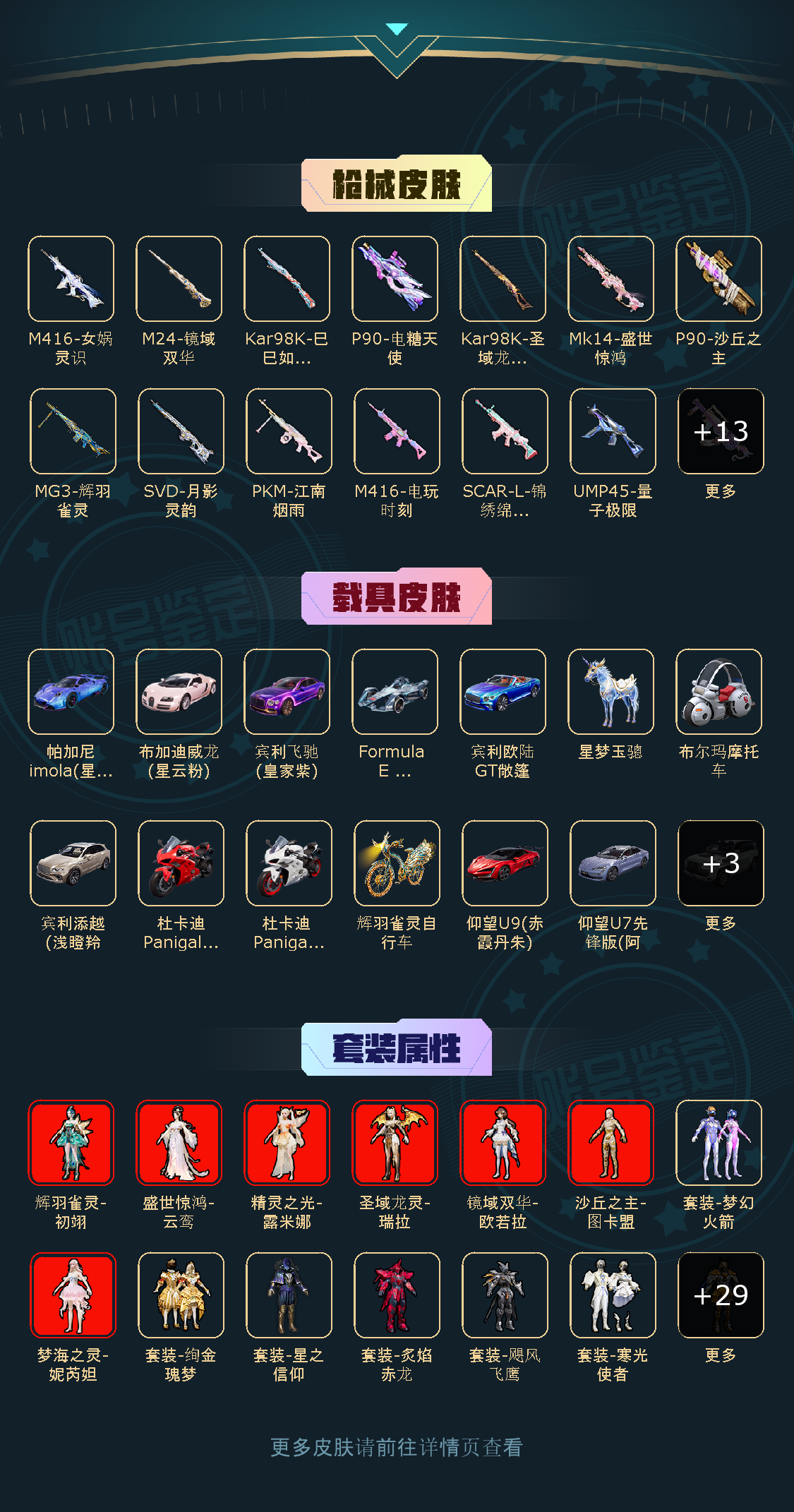 42粉,16载具,118套装,满级木乃伊,6王牌印记,超级王牌8星历史最高段,141248热力值 SCAR-L-梦幻火箭/M416-电玩时刻/M416-全功率超战/M762-电糖天使/GROZA-巴啦啦小魔仙/M416-女娲灵识/AKM-魔法神域/GROZA-精灵之光/M416-墨龙九天/SCAR-L-锦绣绵绵/SCAR-L-时空协奏/蜜獾-辉耀战甲/Mk14-盛世惊鸿/DP-28-暗夜鎏金/MG3-辉羽雀灵/PKM-江南烟雨/P90-电糖天使/UMP45-量子极限/P90-沙丘之主/破片手榴弹-秋玉花灯/烟雾弹-猫咪绅士/Kar98K-圣域龙灵/Kar98K-巳巳如意/M24-镜域双华/AMR-智耀战神/SVD-月影灵韵/仰望U7先锋版(阿盖尔紫)/宾利飞驰(皇家紫)/宾利欧陆GT敞篷(深空蓝)/宾利添越(浅瞪羚棕)/仰望U8(龙石绿)/快艇-瑞蒂奥Espera 34(钢铁灰)/Formula E Gen2(巅峰兰)/糖心拉力赛车(炫动紫)/布加迪威龙(星云粉)/仰望U9(赤霞丹朱)/帕加尼imola(星空蓝)/星梦玉骢/杜卡迪 Panigale V4(星耀白)/辉羽雀灵自行车/布尔玛摩托车/杜卡迪PanigaleV4(杜卡迪红)/