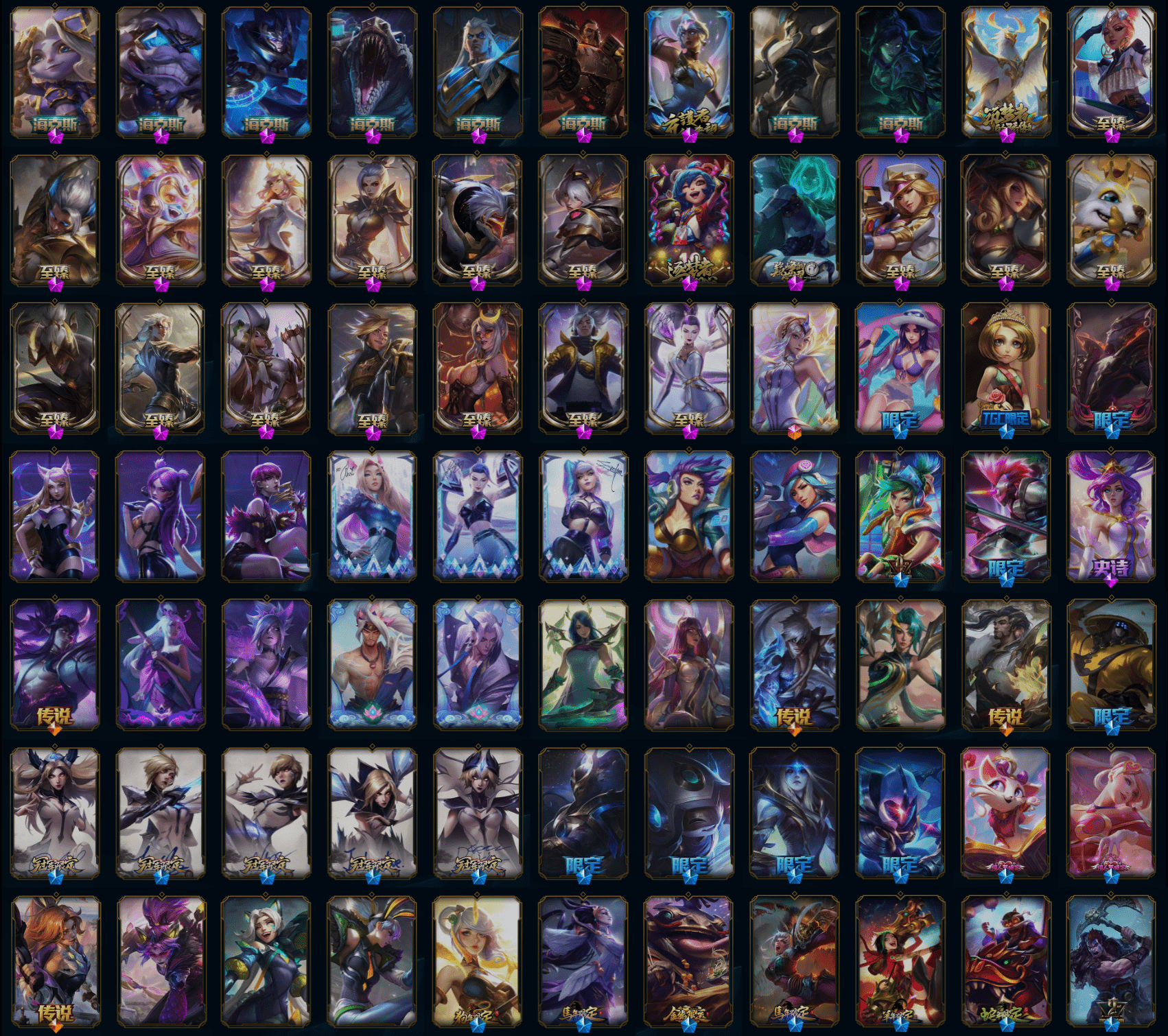 【传说皮肤】鬼魂新娘莫甘娜 至尊魔女莫甘娜 幻灵战斗队长厄运小姐 陆地王者4WD布里茨 苹果机器人布里茨 邪鸦魅影乐芙兰 金牌主播德莱文 灵魂莲华锤石 神龙尊者昼日真龙亚索 源计划毁灭派克 暗星锤石 天煞劫 西部魔影卢锡安 暗星尊烬 黑夜使者亚索 灌篮高手德莱厄斯 奥德赛凯隐 蔷薇绅士杰斯 神王德莱厄斯 女校长菲奥娜 宇航员诺提勒斯 霸天异形卡兹克 苍穹之光韦鲁斯 泳池派对吉格斯 偶像歌手阿狸 符文战熊沃利贝尔 枯萎之壤泽拉斯 暗星女王拉克丝 黯黑魔龙希瓦娜 焰尾妖狐阿狸 星之守护者拉克丝 冰霜亚龙希瓦娜 日蚀骑士蕾欧娜 钢铁军团盖伦 死亡骑士盖伦 黎明使者锐雯 腥红之月鬼武姬阿卡丽 月蚀骑士蕾欧娜 屠龙勇士潘森 炼狱魔犬内瑟斯 战斗学院伊泽瑞尔 源计划净化薇恩 神拳李青 驯龙学者黑默丁格 第三类接触黑默丁格 神龙尊者圣龙李青 地狱行者孙悟空 丧尸布兰德 冰川巨兽墨菲特 上古战魂魔腾 未来战士凯特琳 女主播迦娜 冰霜之刃艾瑞莉娅 律政大亨蒙多 红色男爵库奇 双重冰晶艾尼维亚 电玩女神娑娜 女皇艾希 西部天使艾希 合金巨兽努努和威朗普 恶魔之刃泰达米尔 黑夜使者索拉卡 约德尔国队长提莫 驯龙炮手崔丝塔娜 烈焰雄心崔丝塔娜 恶魔男爵瑞兹 黎明使者索拉卡 提莫约德尔人的一大步 血石领主弗拉基米尔 战地机甲厄加特 源计划林易 钢铁之翼凯尔 魔幻卡牌崔斯特 铁哥们儿奥拉夫 女警狙击凯特琳 地狱之门卫士加里奥 绅士科加斯 战场女武神凯尔 大天使长米迦勒凯尔
