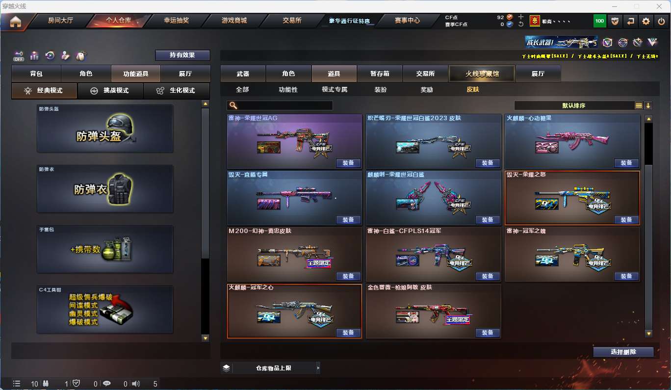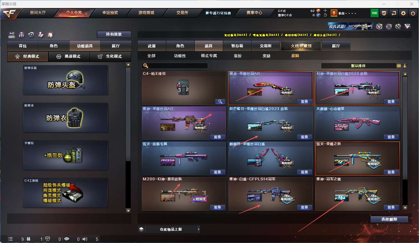 【m200-幻神+幻神-荣耀世冠白鲨2023+幻神-黄忠】 【98k星神+音效卡】 【王者白虎】 【qbz金色蔷薇+音效卡】 【荣耀世冠-火麒麟】 【火麒麟+音效卡+火麒麟-冠军之心】 【雷神+音效卡+雷神-白鲨14冠军+雷神-冠军之魄】 【黑骑士】 【毁灭】 【王者火魄】 【黑鲨 hk417-朱雀】 【3手呛 修罗 天神 柯尔特荣耀世冠白鲨2023】 【5近战 屠龙 麒麟刺 王者之锋】 【手雷 云龙雷*2 竞技荣光*2】 【角色 星际战将 雨棠】 【98k星神音效卡】