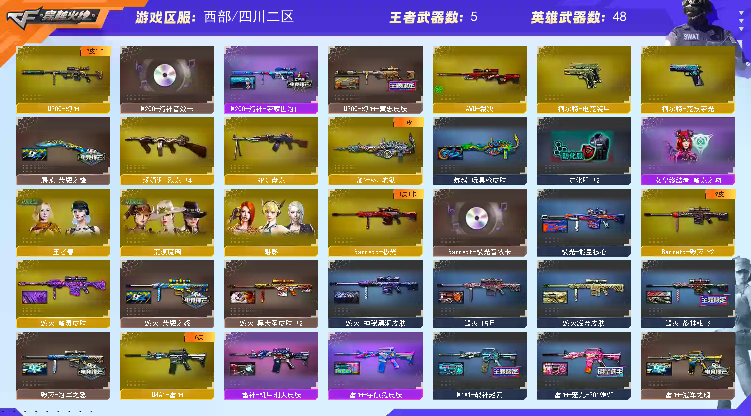 【幻神三件套】【幻神2皮】【死亡之眼】【竞技荣光套装X2套】【神秘礼盒背包】【M200-幻神】【M200-幻神-荣耀世冠白鲨】【M200-幻神-黄忠皮肤】【M200-幻神音效卡】【AWM-裁决】【白虎-电玩蓝兔】【柯尔特-竞技荣光】【黄金猫猫手套-白鲨】【加特林-炼狱】【RPK-盘龙】【魂·炼狱-玩具枪】【汤姆逊-烈龙】【死亡之眼】【荒漠琉璃】【乔伊教练】【王者春】【魅影】【M4A1-雷神】【雷神-荣耀之魄】【雷神-宠儿-2019MVP】【雷神-冠军之魄】【M4A1-战神赵云】【雷神-宇航兔皮肤】【雷神-机甲刑天皮肤】【AK47-火麒麟】【火麒麟-巅峰荣耀】【火麒麟-轻羽皮肤】【火麒麟-战神关羽】【火麒麟-平天大圣】【火麒麟-百城】【火麒麟-雷神】【M4A1-黑骑士】【黑骑士-战神马超】【黑骑士-摸金校尉】【黑骑士-暗月】【M4A1-黑骑士音效卡】【Barrett-毁灭】【毁灭-荣耀之怒】【毁灭-冠军之怒】【毁灭耀金皮肤】【毁灭-战神张飞】【毁灭-暗月】【毁灭-黑大圣皮肤】【毁灭-魔灵皮肤】【毁灭-神秘黑洞皮肤】