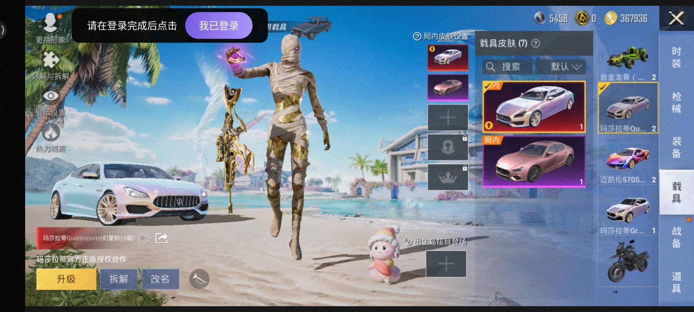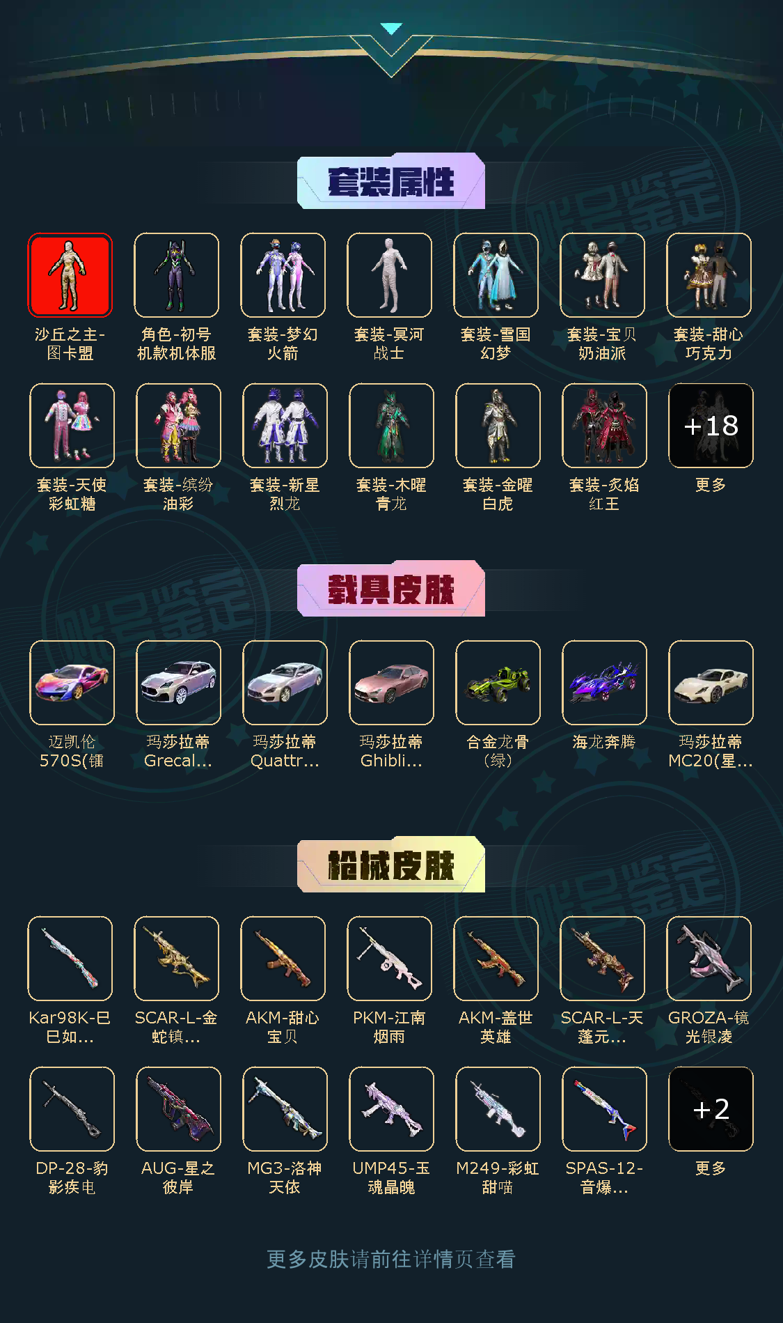 30粉,7载具,162套装,12王牌印记,卓越王牌12星历史最高段,96793热力值 AKM-盖世英雄/AKM-甜心宝贝/AUG-星之彼岸/SCAR-L-天蓬元帅/M416-五爪金龙/M416-墨龙九天/SCAR-L-金蛇镇世/GROZA-镜光银凌/SPAS-12-音爆索尼克/M249-彩虹甜喵/MG3-洛神天依/PKM-江南烟雨/UMP45-玉魂晶魄/Kar98K-巳巳如意/玛莎拉蒂Quattroporte(幻星粉)/玛莎拉蒂Ghibli(粉)/玛莎拉蒂Grecale(幻星粉)/海龙奔腾/合金龙骨(绿)/玛莎拉蒂MC20(星石白)/迈凯伦570S(镭射紫)/